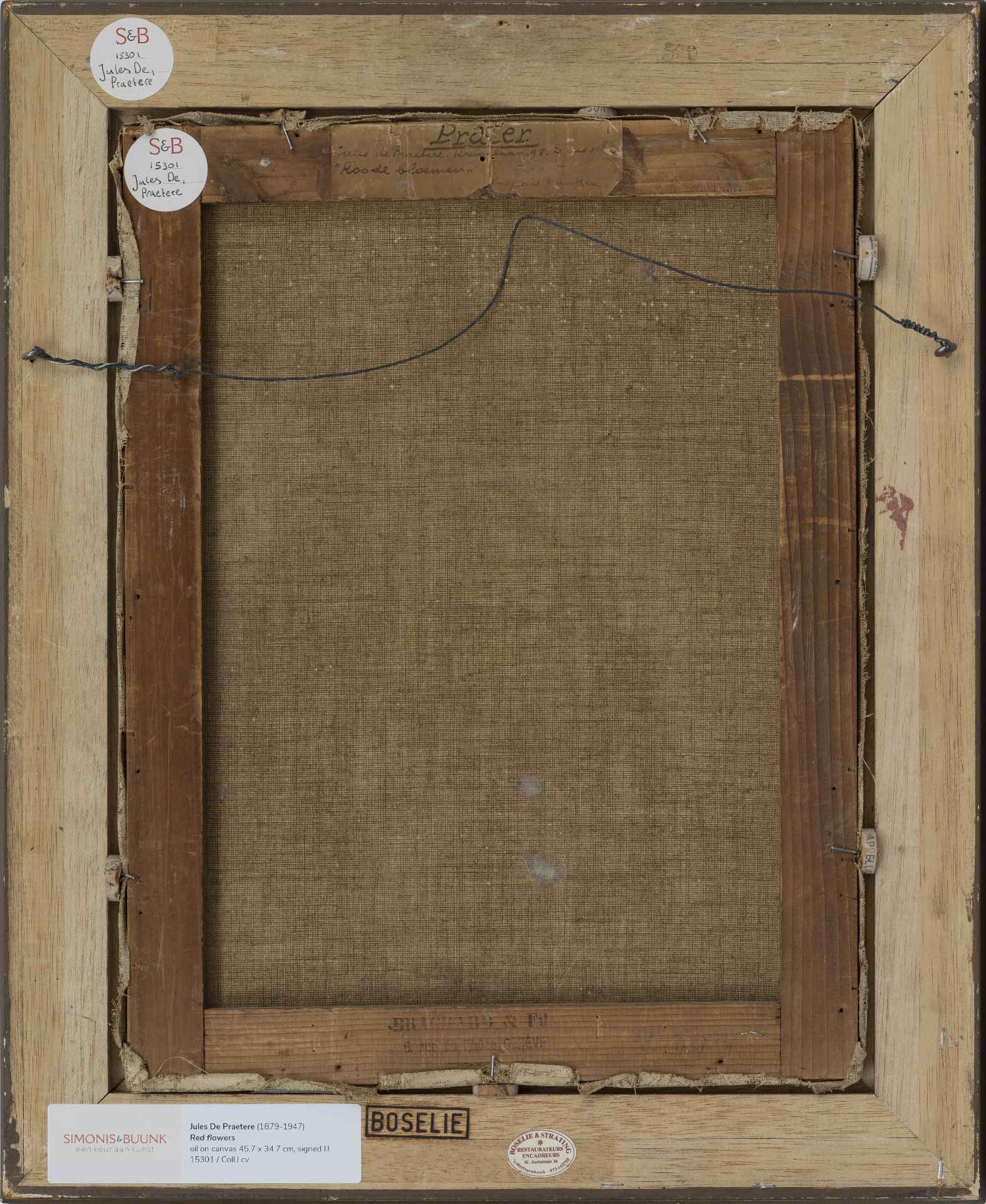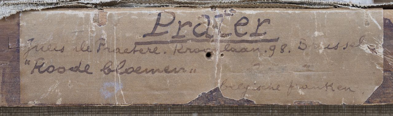 Der Radierer, Drucker und expressionistische Maler Jules De Praetere lernte Valerius De Saedeleer und Gustave van de Woestijne an der Genter Akademie kennen. Mit ihnen wurde er später, wenn auch nur für kurze Zeit (1900-1903), Teil der Künstlerkolonie Latem. Wie seine Freunde greift er auf das Mittelalter zurück und arbeitet dort als Weber, Glaser, Schmied, Radierer und Drucker. Nach seiner Abreise 1903 arbeitete er als Lehrer und war ab 1905 Direktor der Kunstgewerbeschule und des Museums für angewandte Kunst in Zürich. Also beginnt er zu malen: bunte, wilde Stillleben, die er mit 'Prater' signiert.