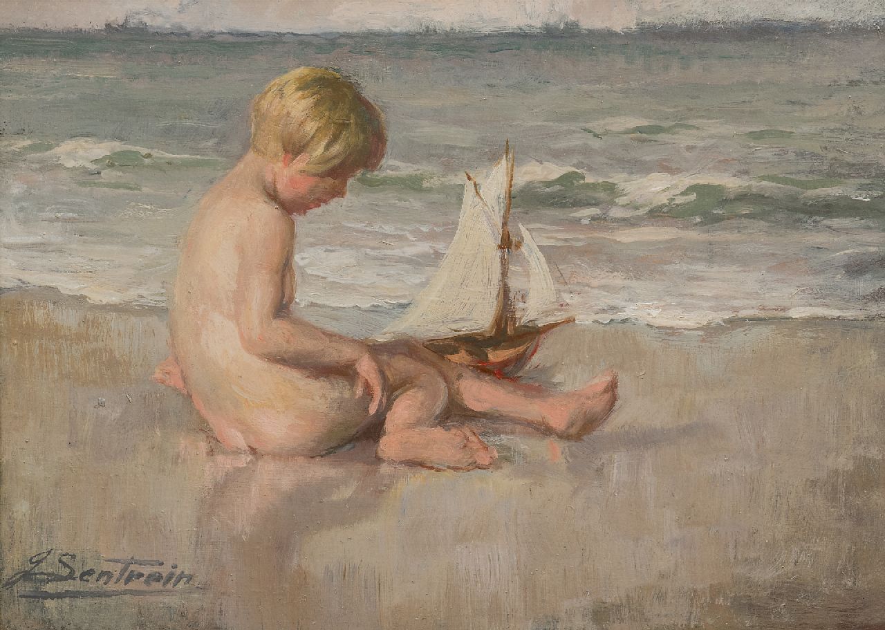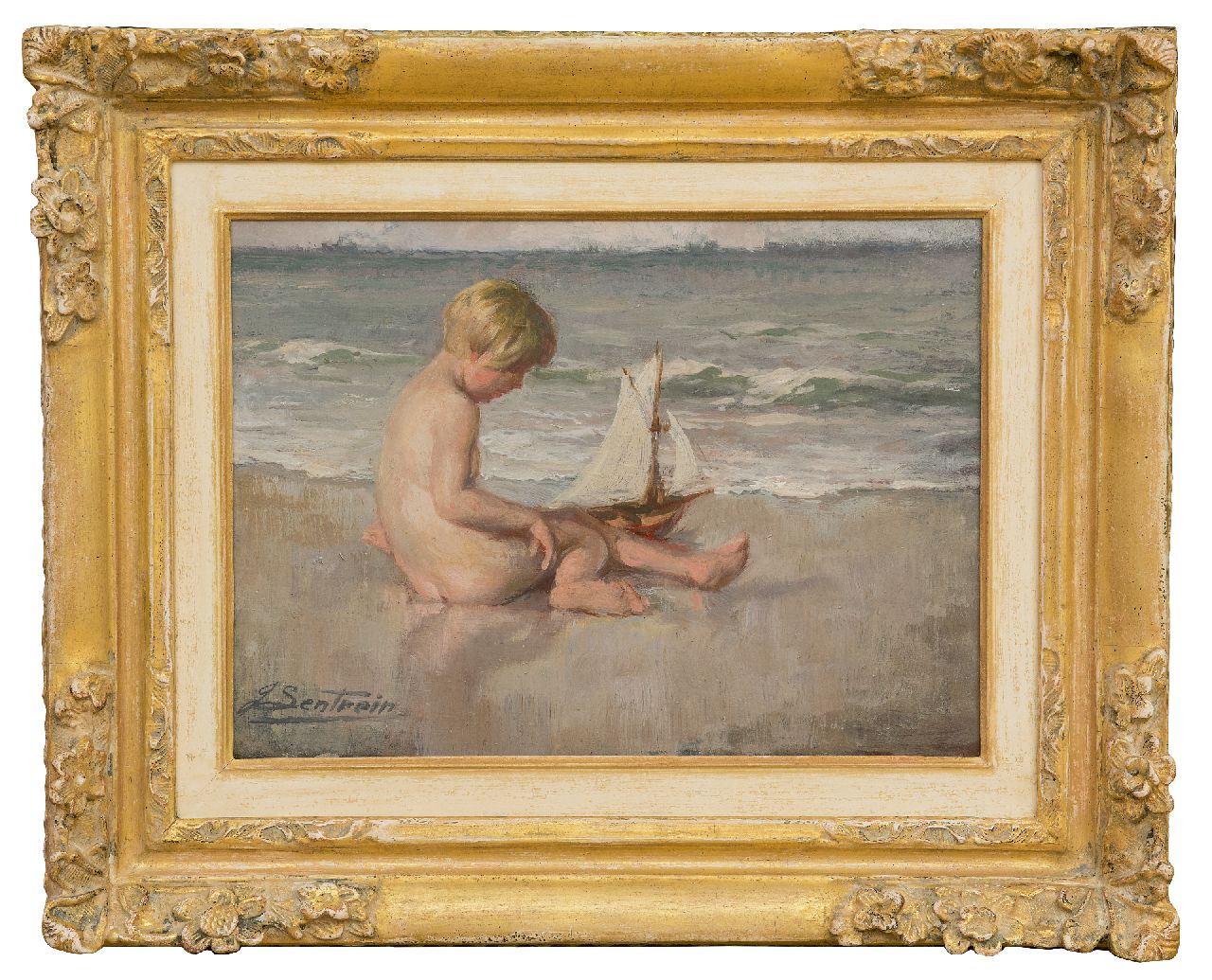 Jules Lentrein Kunstwerk • Gemälde • zu verkaufen Spielendes Mädchen auf dem Strand