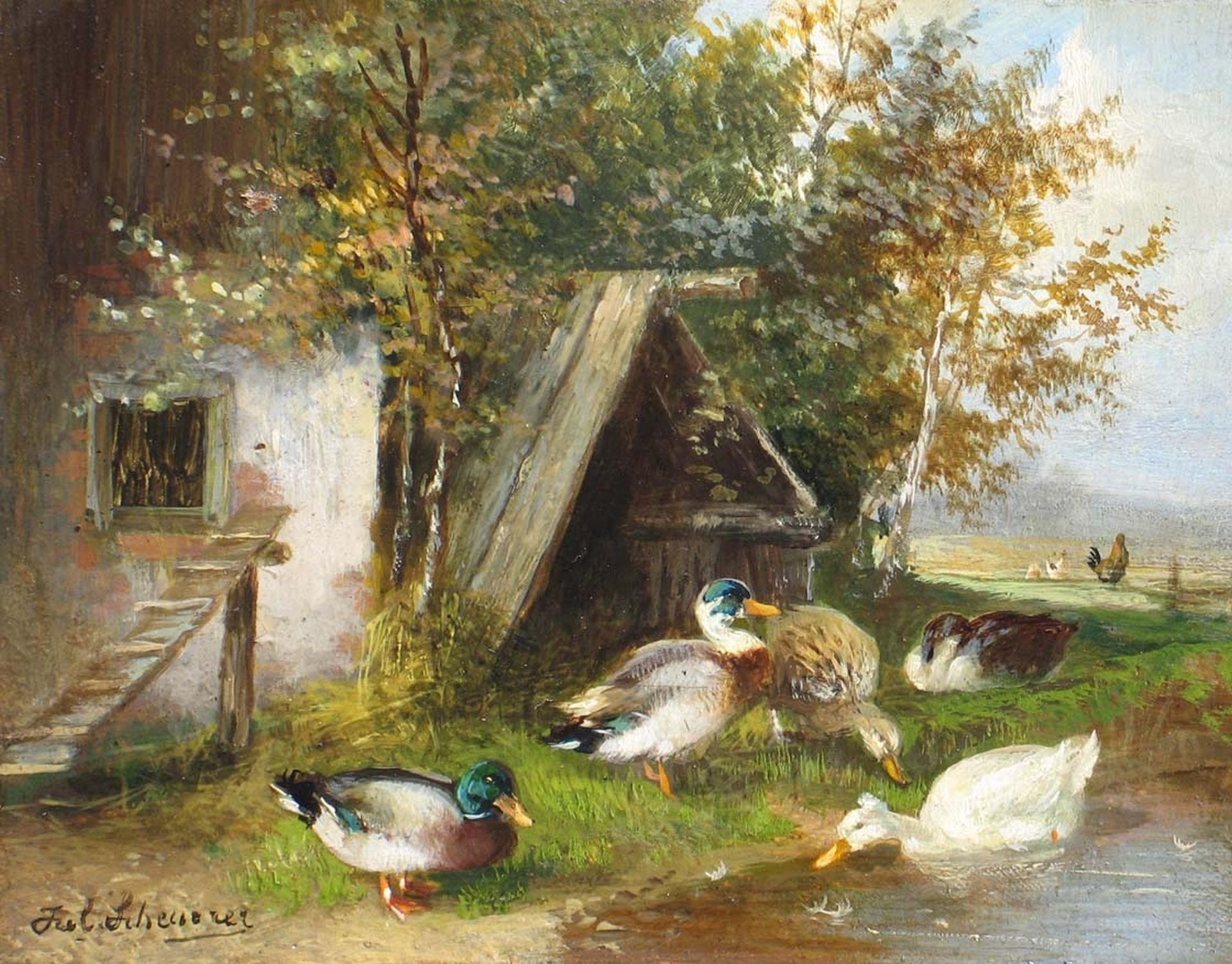 Julius Scheuerer Kunstwerk • Gemälde • zuvor zu verkaufen Ducks by a pool