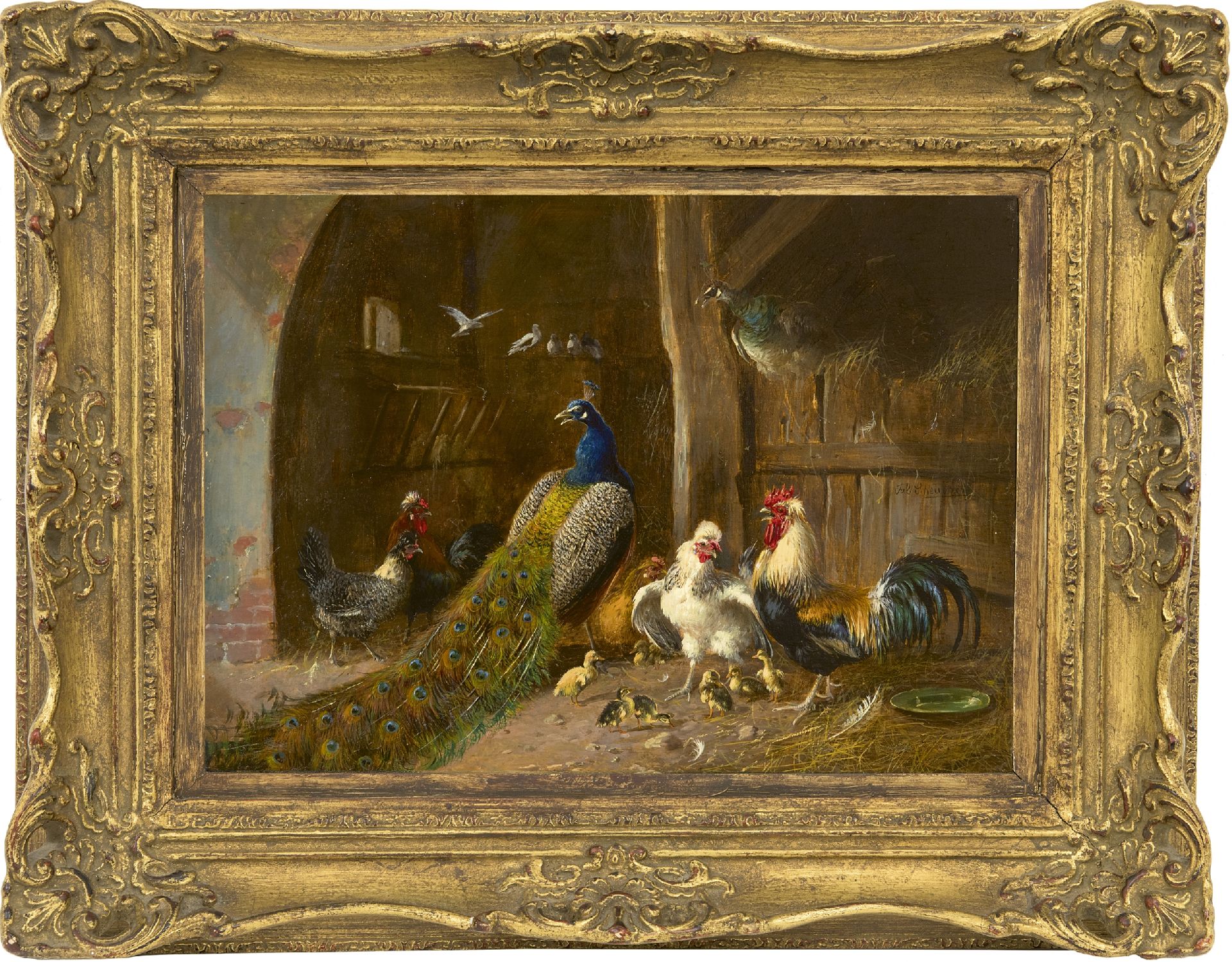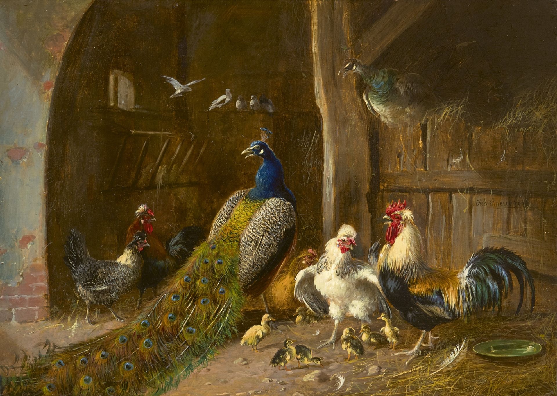 Julius Scheuerer Kunstwerk • Gemälde • zuvor zu verkaufen Pfauen mit Hahn und Hühnern in der Scheune