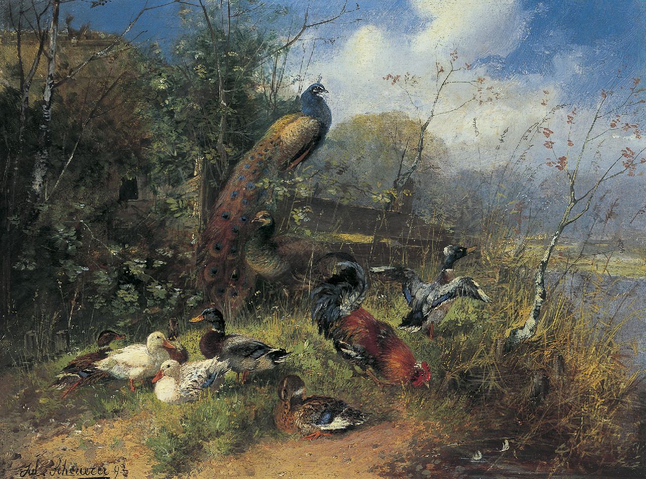 Obwohl er kurzfristig an der Akademie in München studierte, war der süddeutsche Julius Scheuerer grösstenteils Autodidakt. Er malte Landschaften und Wild- und Jagdszenen, machte sich aber einen Namen mit Geflügelszenen. Scheuerer kam aus einer künstlerischen Familie. Sein jüngerer Bruder Otto war gleichfalls ein Maler und spezialisierte sich auch auf die Malerei von Wild, Kleinvieh und Vögel.