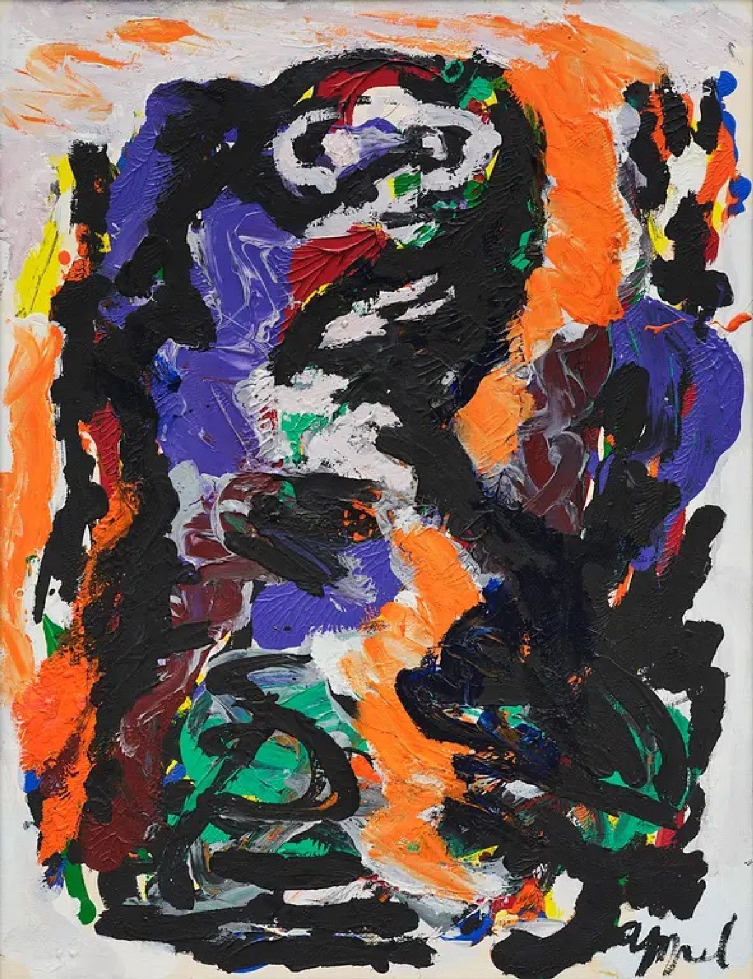Karel Appel war einer der Hauptfiguren der nachkriegs CoBrA-Bewegung (1948-1951). Sein Werk sieht man als repräsentativ für die Ideale dieser Gruppe von Malern, die in ihre Werke den Widerstand ausdruckten gegen die traditionelle Malerei mit ihren Regeln und Tabus. In seiner CoBra-Zeit malte Appel Fabeltiere und Phantasiewesen. Nach 1951 wurde sein Malereistil immer stärker, bis dann die Linie und die Farbfläche miteinander verschmelzen zu einer turbulenten, expressiven Farbenmase.