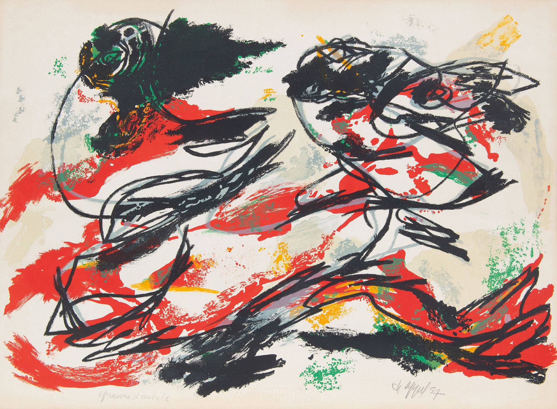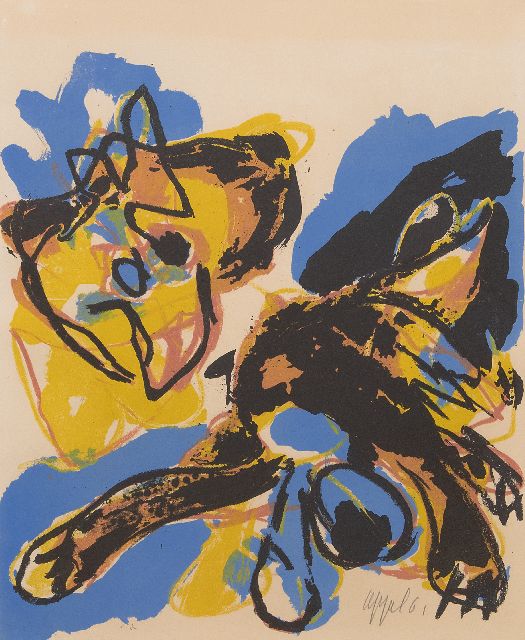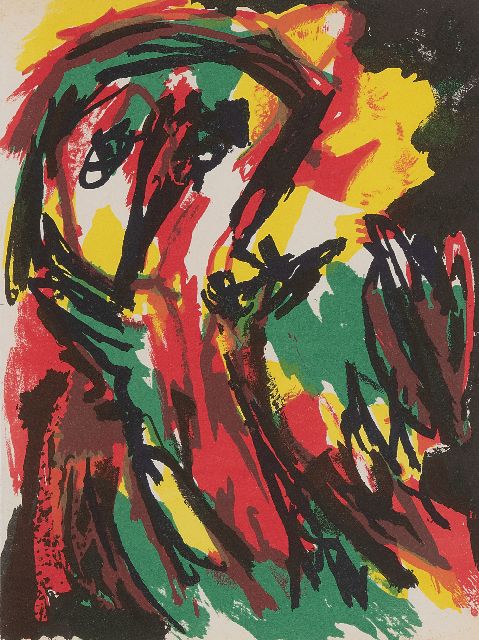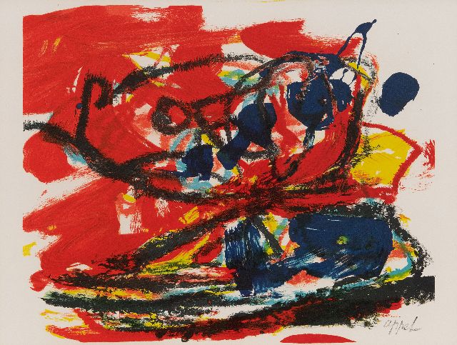 Karel Appel war einer der Hauptfiguren der nachkriegs CoBrA-Bewegung (1948-1951). Sein Werk sieht man als repräsentativ für die Ideale dieser Gruppe von Malern, die in ihre Werke den Widerstand ausdruckten gegen die traditionelle Malerei mit ihren Regeln und Tabus. In seiner CoBra-Zeit malte Appel Fabeltiere und Phantasiewesen. Nach 1951 wurde sein Malereistil immer stärker, bis dann die Linie und die Farbfläche miteinander verschmelzen zu einer turbulenten, expressiven Farbenmase.