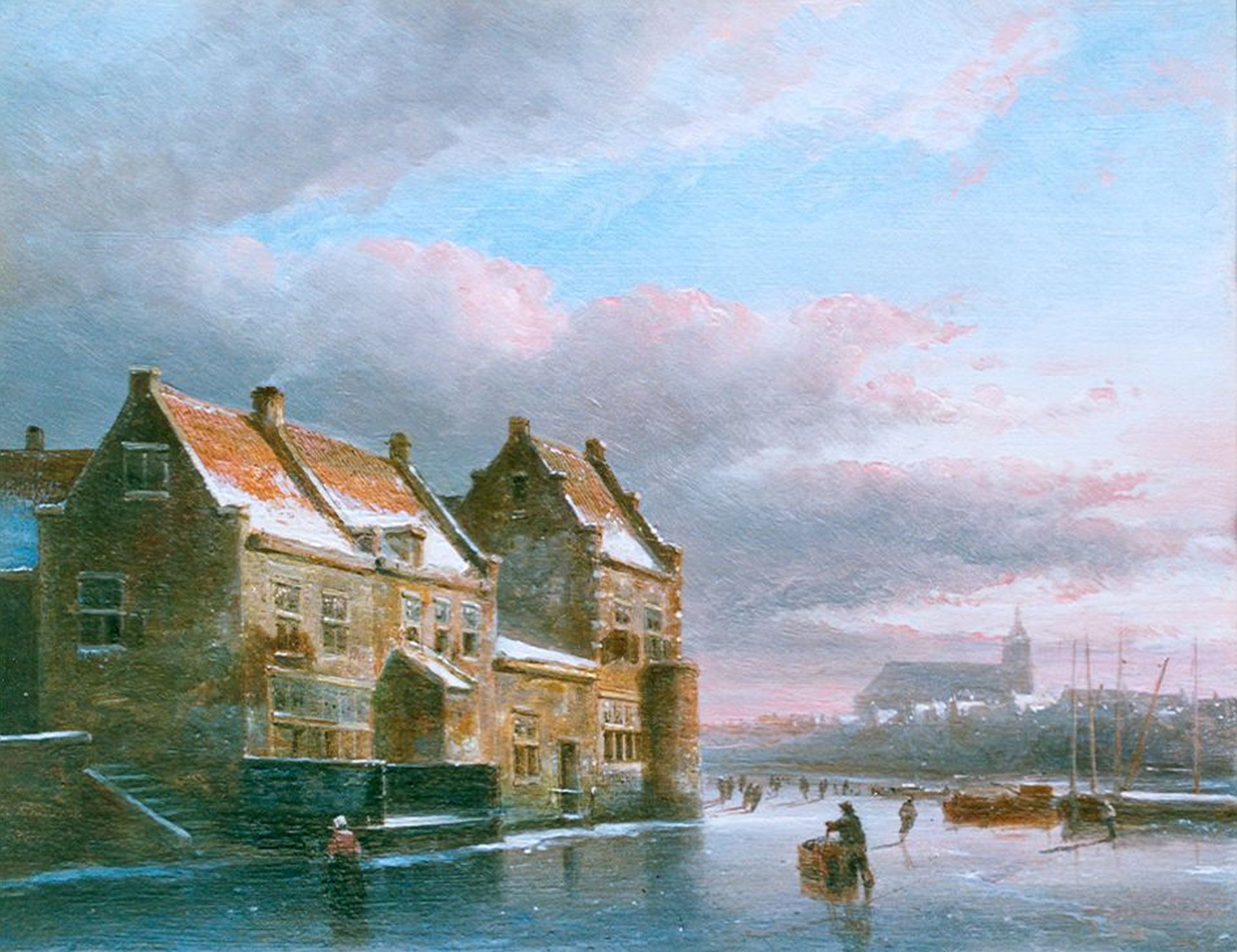 Kasparus Karsen Kunstwerk • Gemälde • zuvor zu verkaufen Skaters on a frozen canal at sunset