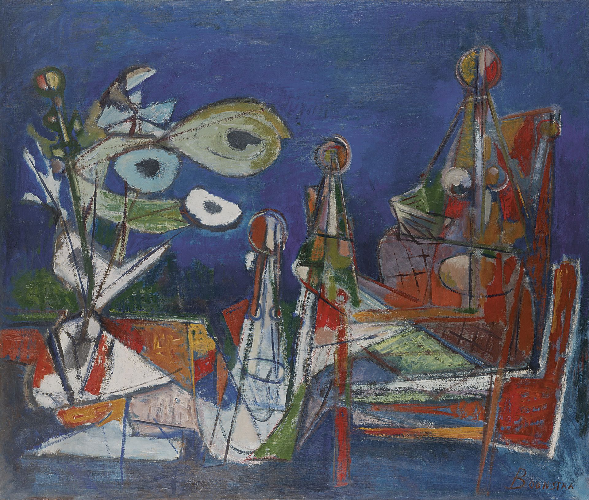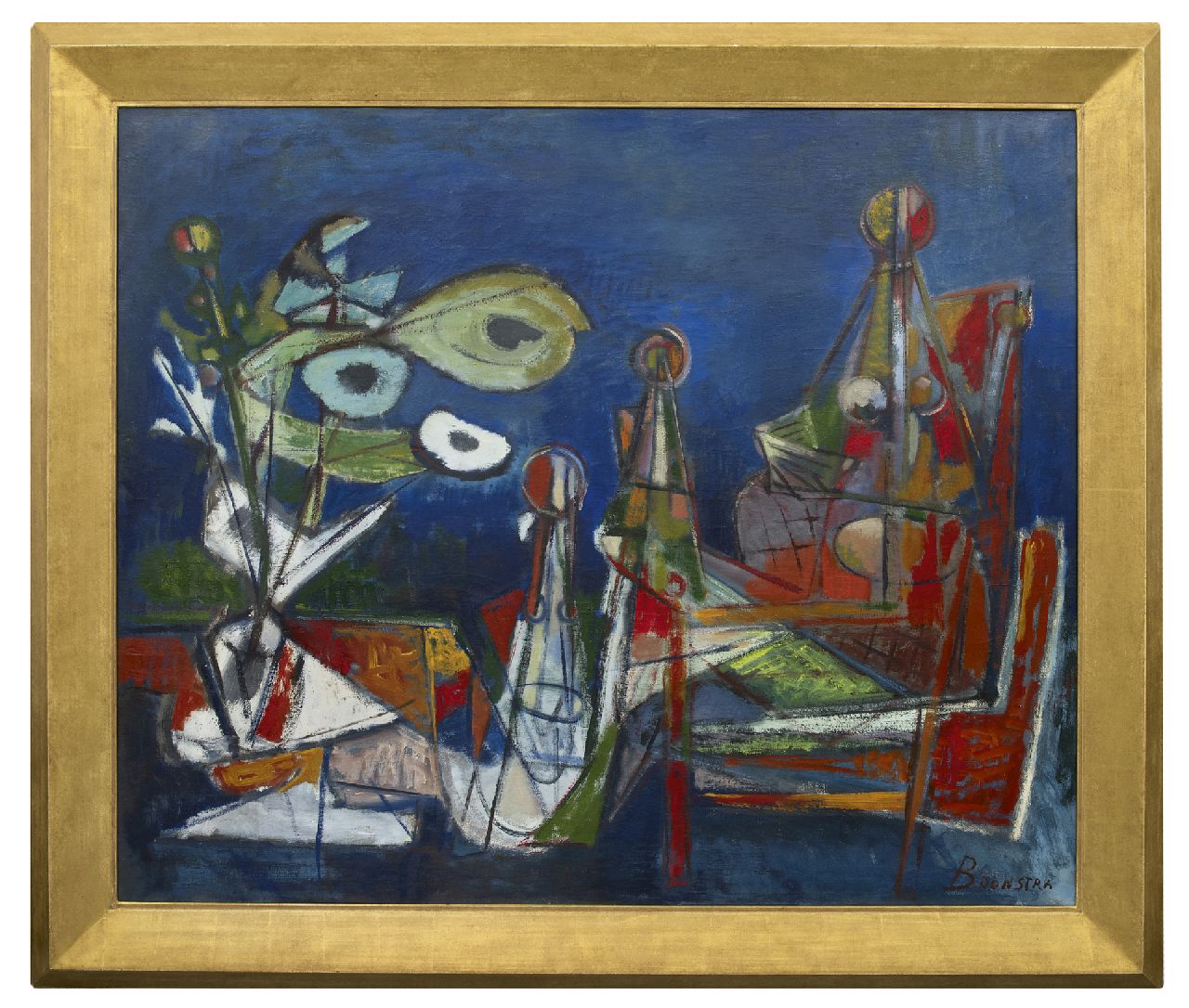 Klaas Boonstra, im Jahre 1905 in Krommenie geboren, entwickelte sich im Anfang völlig selbständig zu einem experimental abstrakten Maler. 1940 liess er sich in Amsterdam nieder, wo er in die stürmische Künstlerszene der Nachkriegszeit aufgenommen wurde. Er malte abstrakte Kompositionen, die aus einem dynamischen Zusammenspiel von farbigen Phantasieformen bestanden, die intuitiv, während der Arbeit unter seinen Händen entstanden. In seinen Werken aus den vierzigen Jahren sieht man vor allen Dingen der Einfluss von Picasso und Matisse. Ab 1951 gehörte Boonstra zusammen mit u.a. Willy Boers, Brands und Rooskens zu der Gruppe Creatie. Dann folgte das Hinüberwechseln in die Groep 54 und die Liga Nieuwe Beelden.