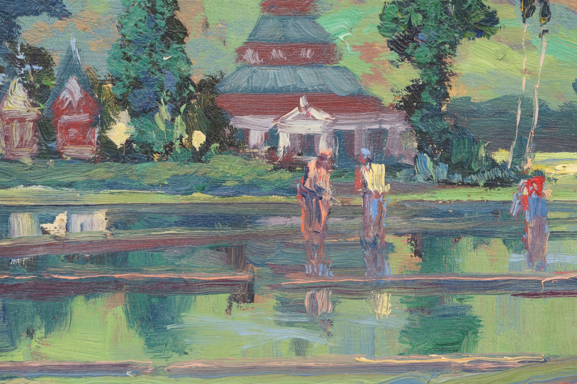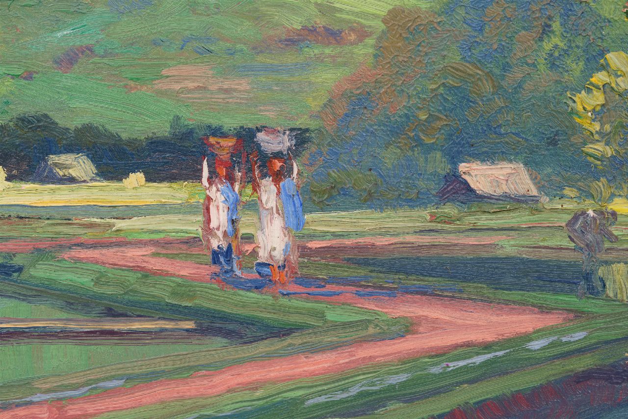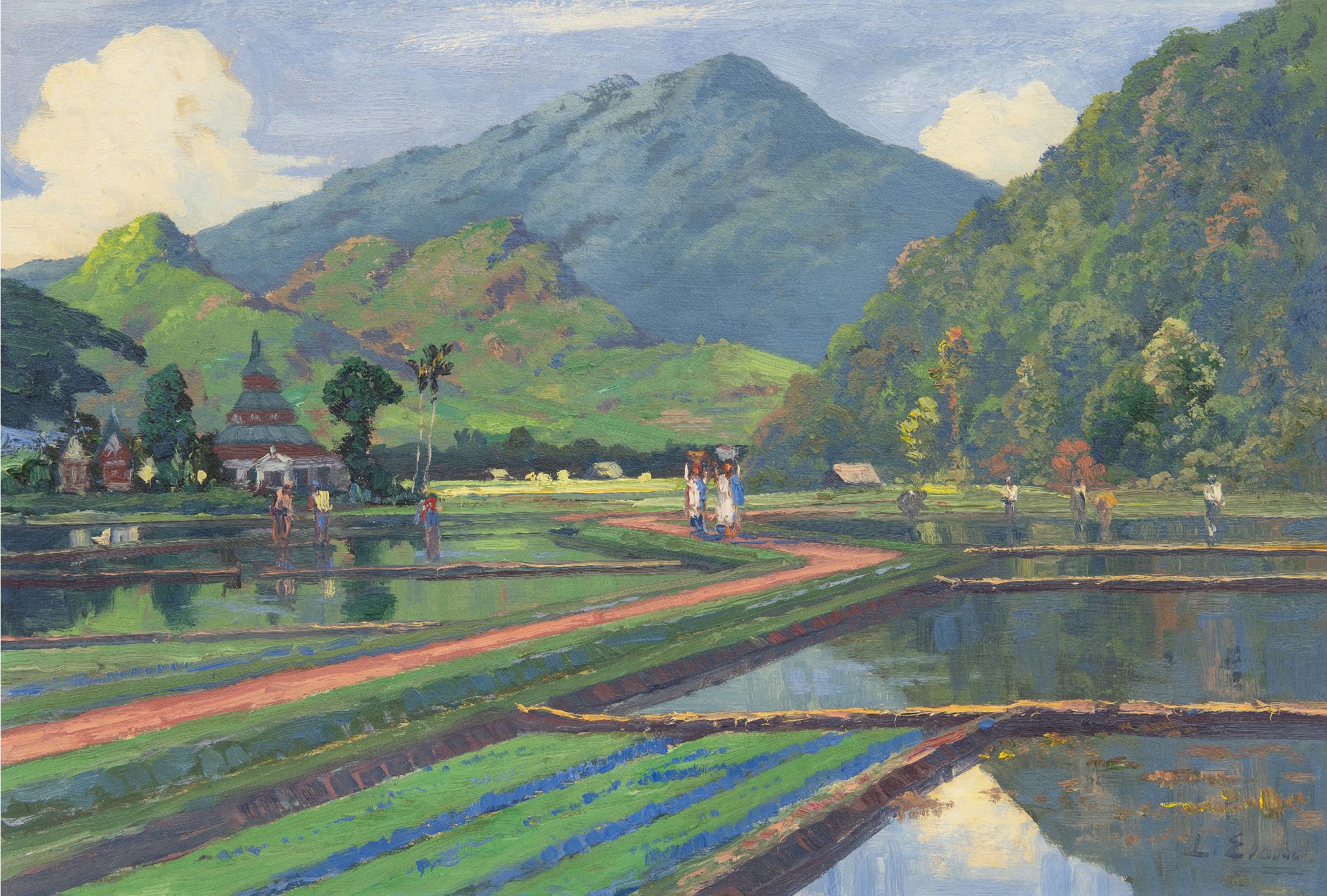 Leo Eland ist einer der wichtigsten Vertreter der indischen Schule. Er wurde 1884 in Salatiga auf der Insel Java geboren. Zwischen 1920 und 1929 kam er endgültig in die Niederlande, wo er in Den Haag lebte und arbeitete. Sein Oeuvre besteht hauptsächlich aus farbenfrohen, impressionistischen Landschaften, die oft mit Figuren geschmückt sind. Er fertigte auch Dioramen und Panoramabilder für Kolonialausstellungen an.