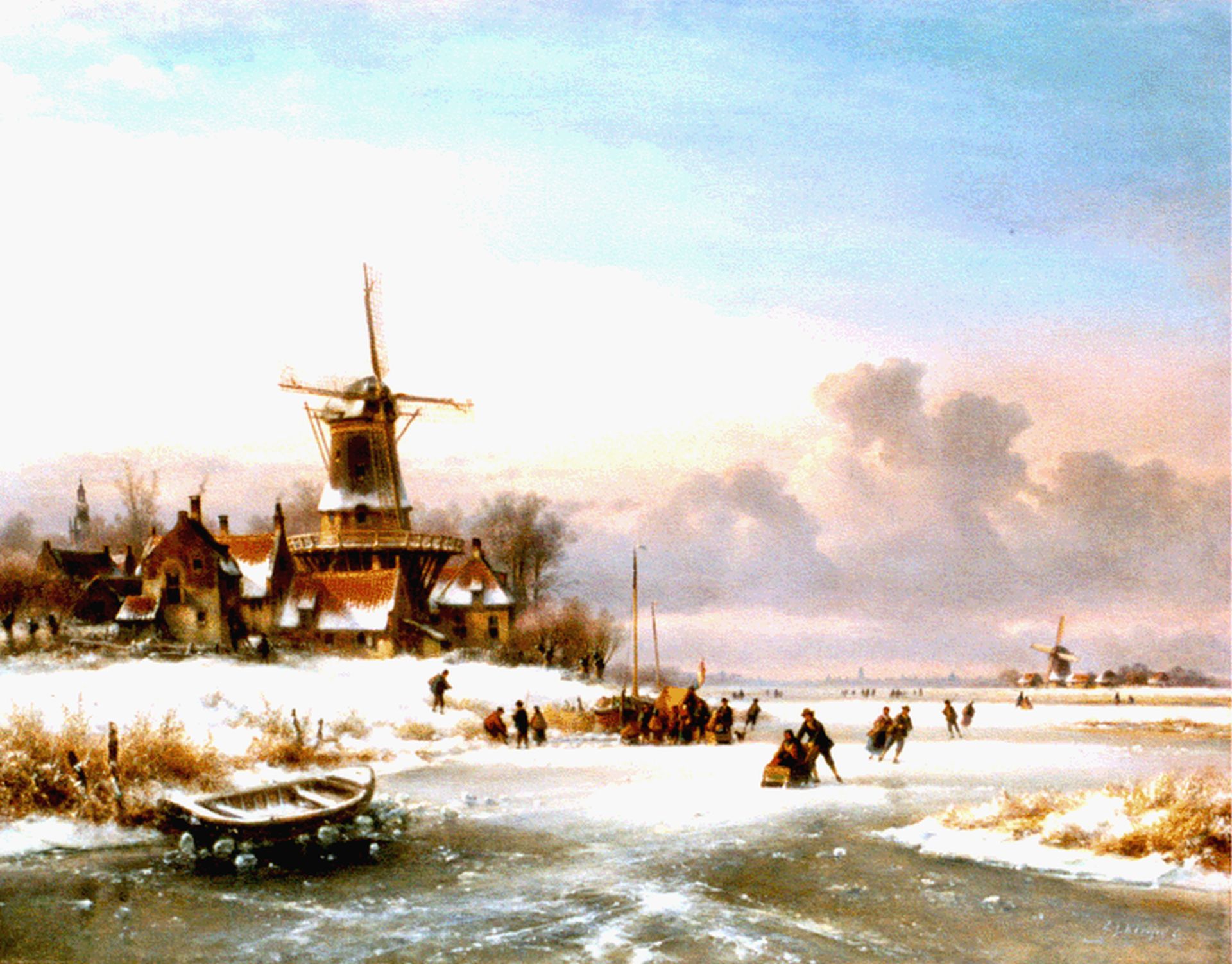 Lodewijk Johannes Kleijn Kunstwerk • Gemälde • zuvor zu verkaufen A winter landscape with skaters by a 'koek en zopie'