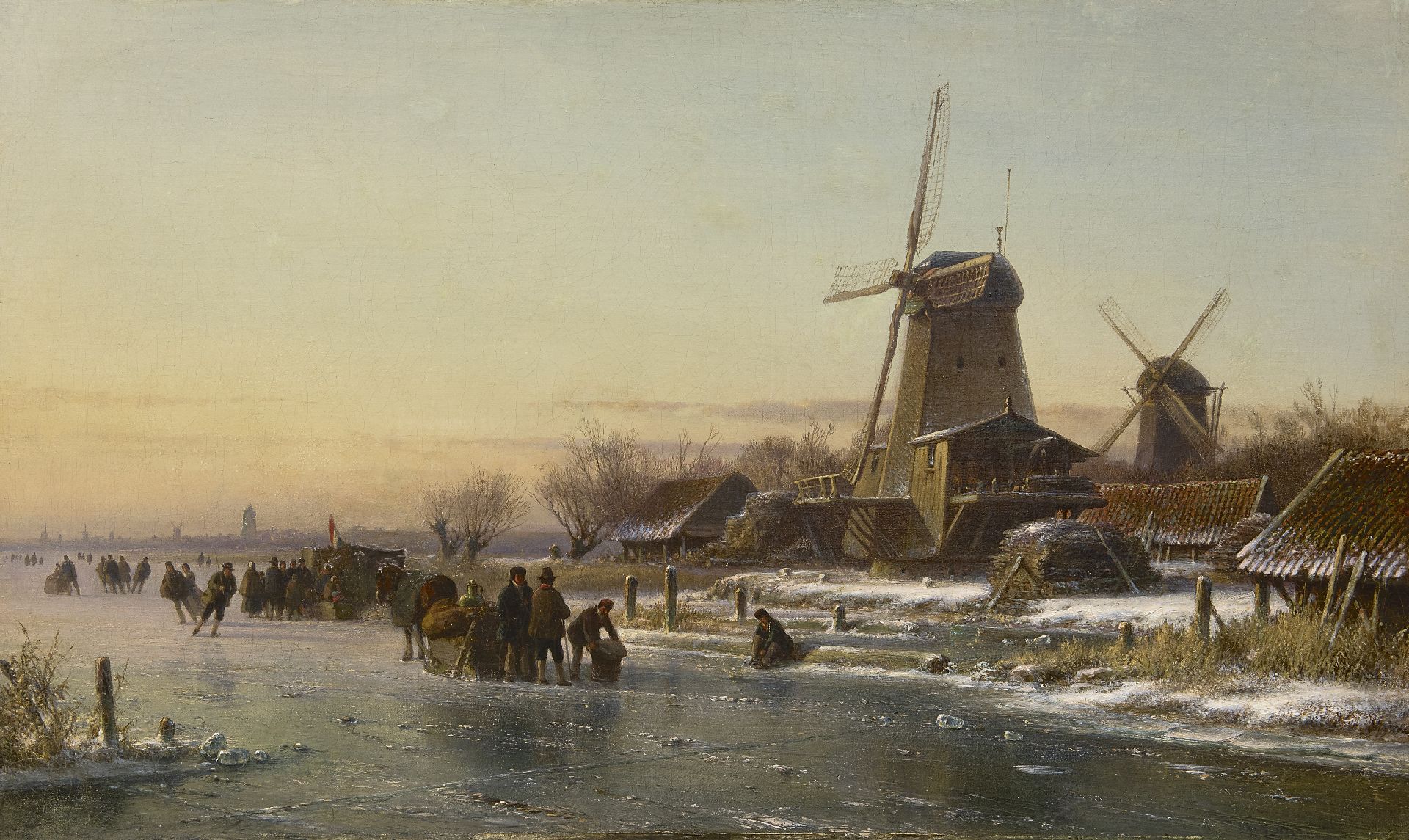 Lodewijk Johannes Kleijn Kunstwerk • Gemälde • zuvor zu verkaufen Schlittschuhläufer und 'Koek-en-zopie-Bude bei einer Holzsägemühle