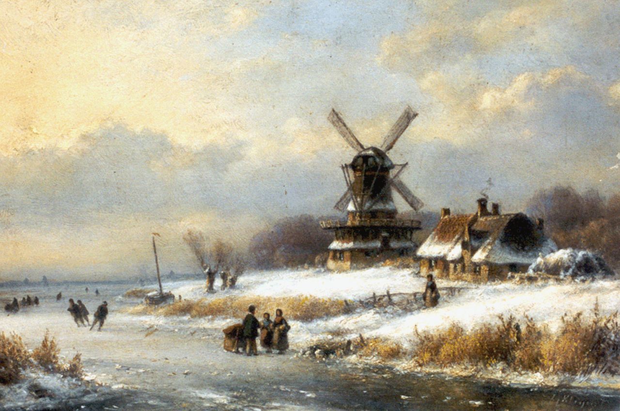 Lodewijk Johannes Kleijn Kunstwerk • Gemälde • zuvor zu verkaufen Skaters on a frozen waterway