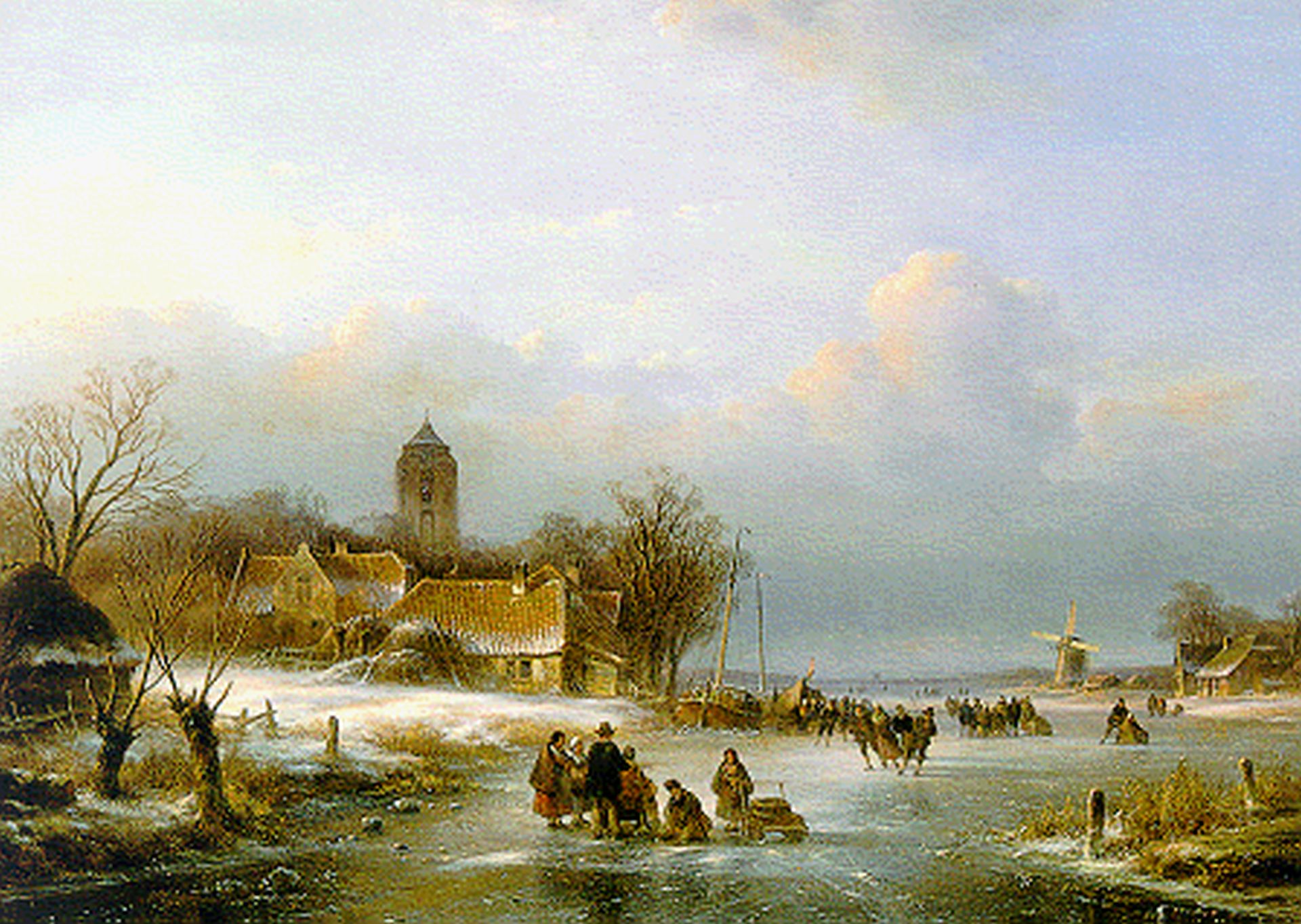 Lodewijk Johannes Kleijn Kunstwerk • Gemälde • zuvor zu verkaufen Skaters on the ice by a 'koek en zopie'