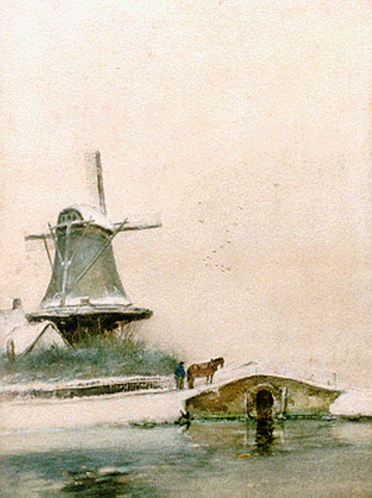 Louis Apol Kunstwerk • Aquarell • Zeichnung • zuvor zu verkaufen A windmill in a snow-covered landscape