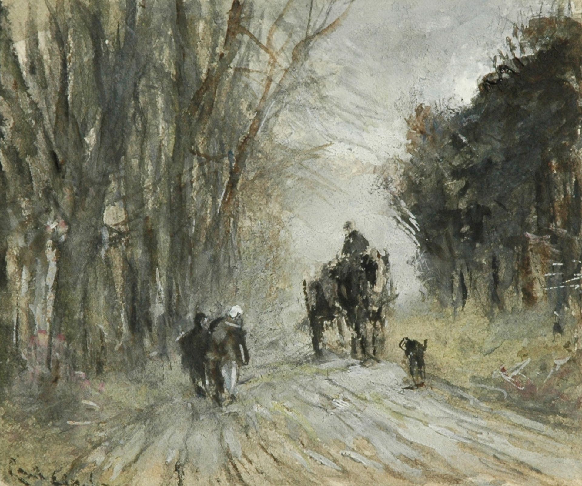 Louis Apol Kunstwerk • Aquarell • Zeichnung • zuvor zu verkaufen Horse and carriage and figures on a snowy forest path