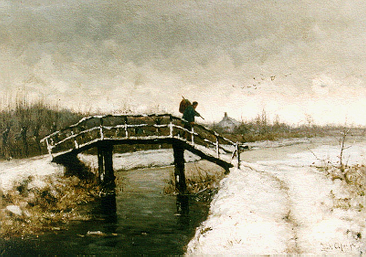 Louis Apol Kunstwerk • Gemälde • zuvor zu verkaufen A traveller on a draw-bridge in a winter landscape