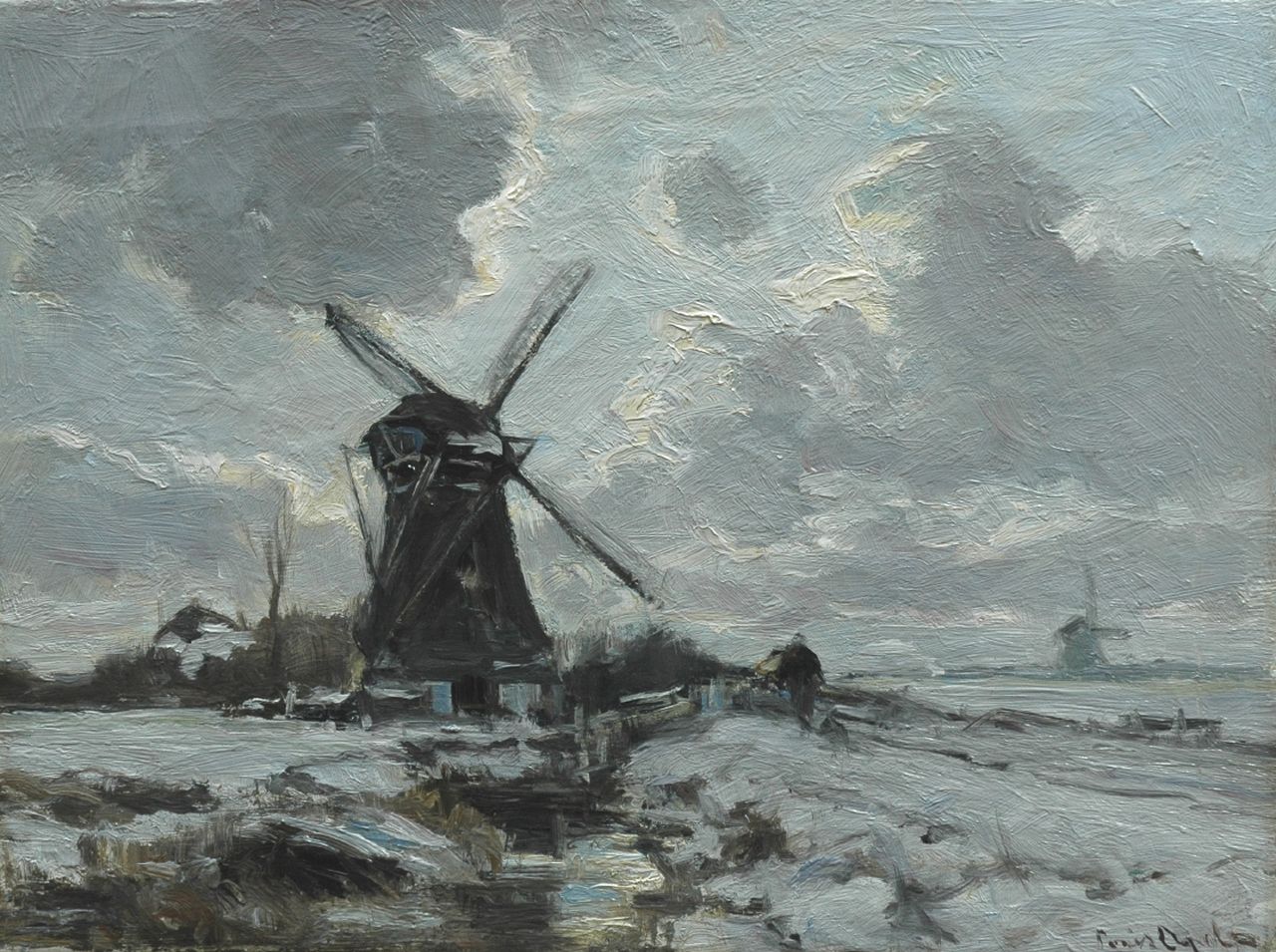 Louis Apol Kunstwerk • Gemälde • zuvor zu verkaufen A windmill in a snow-covered landscape