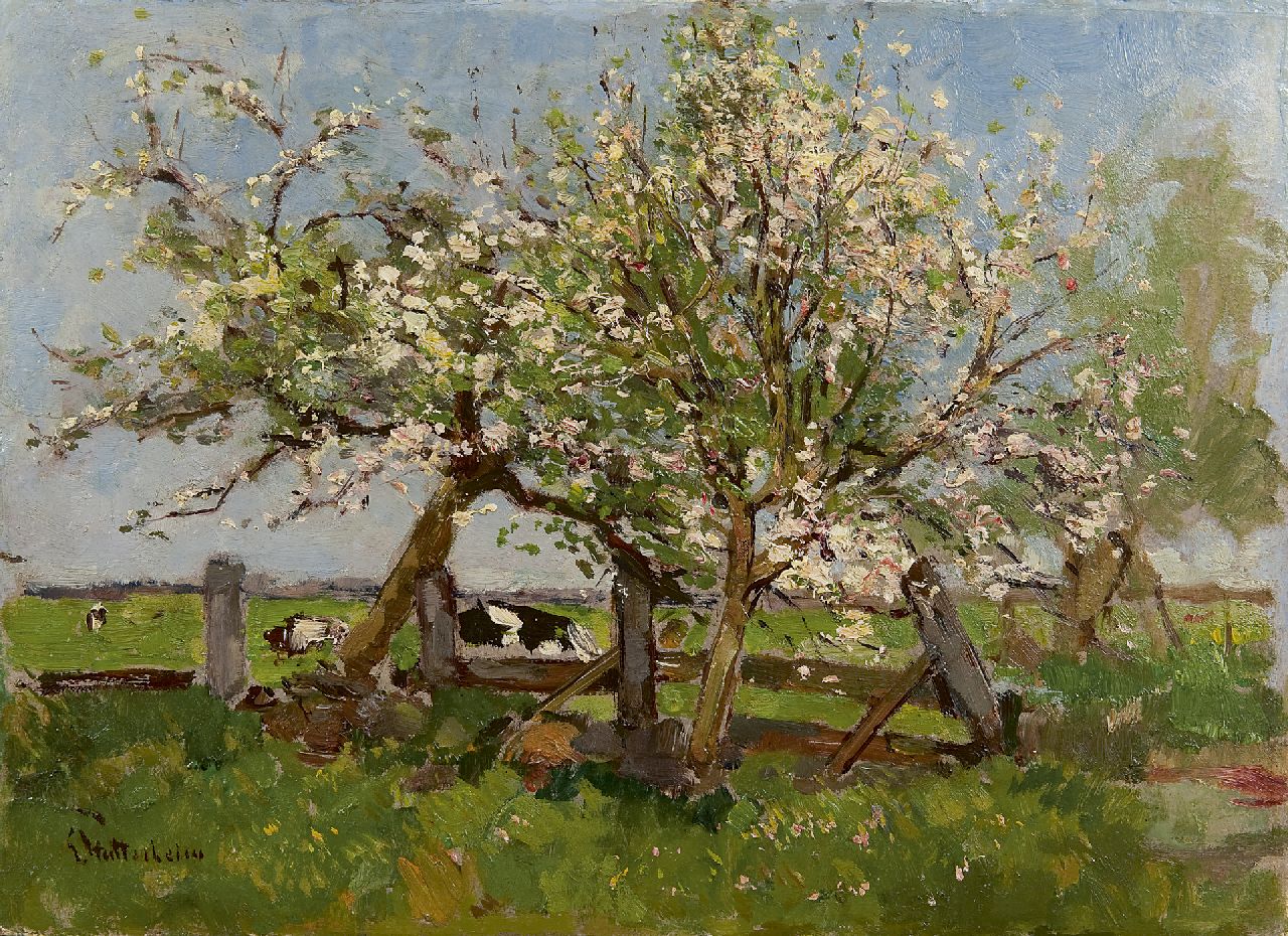 Louis Stutterheim Kunstwerk • Gemälde • zuvor zu verkaufen Blütenbäume in einer Wiese mit Kühen