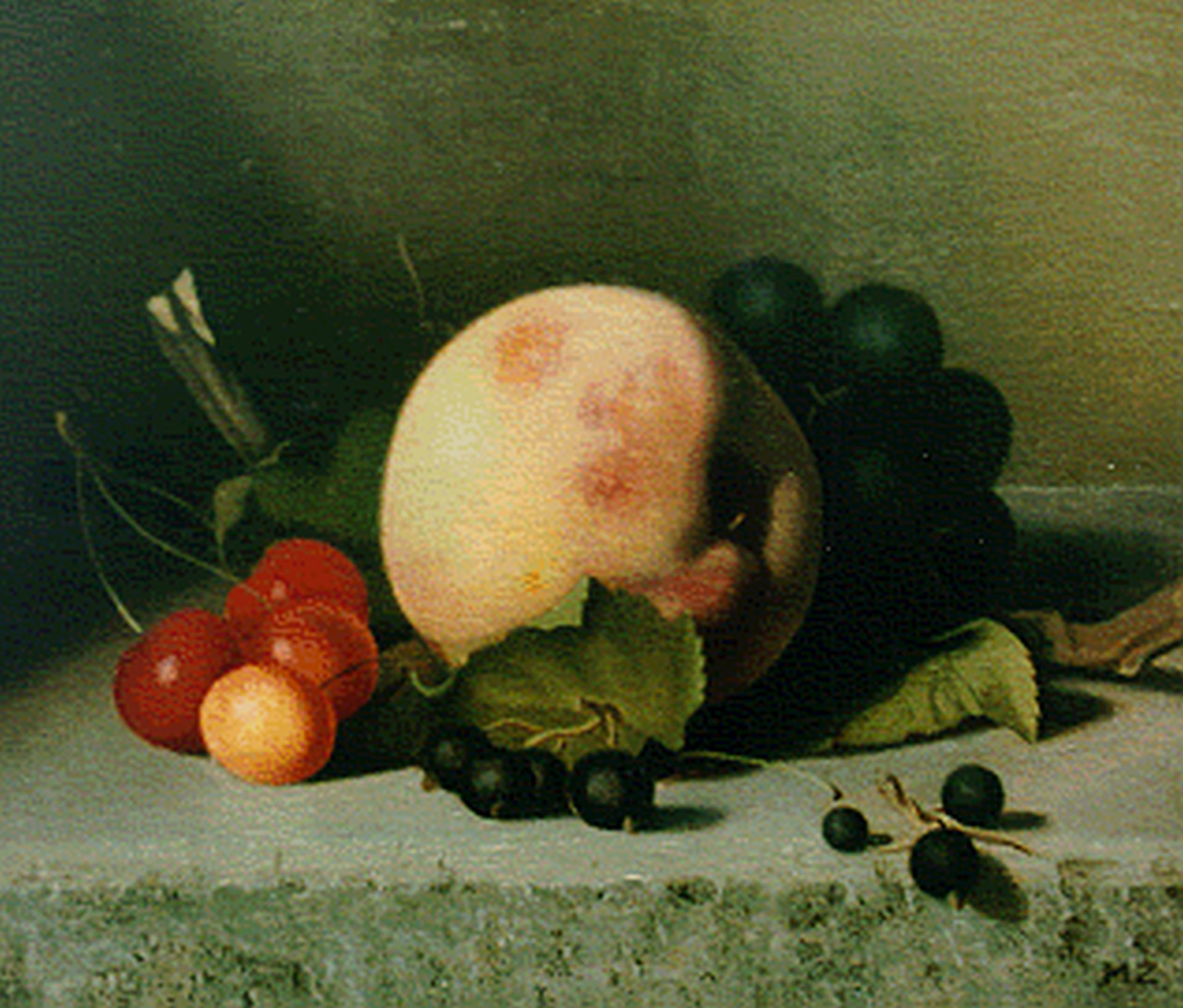 Marguerite Hynckes-Zahn Kunstwerk • Gemälde • zuvor zu verkaufen A still life with cherries, grapes and a peach