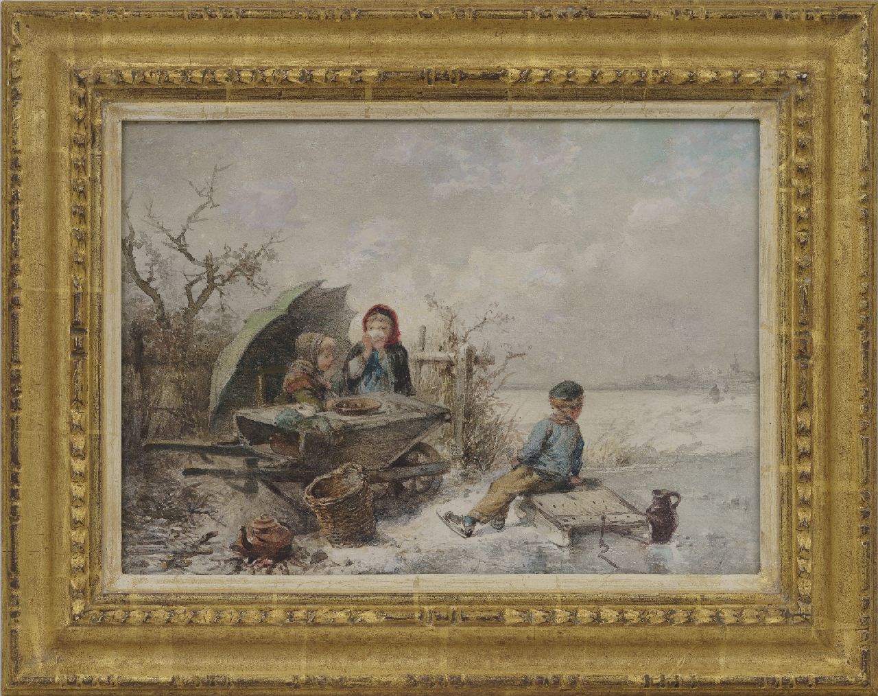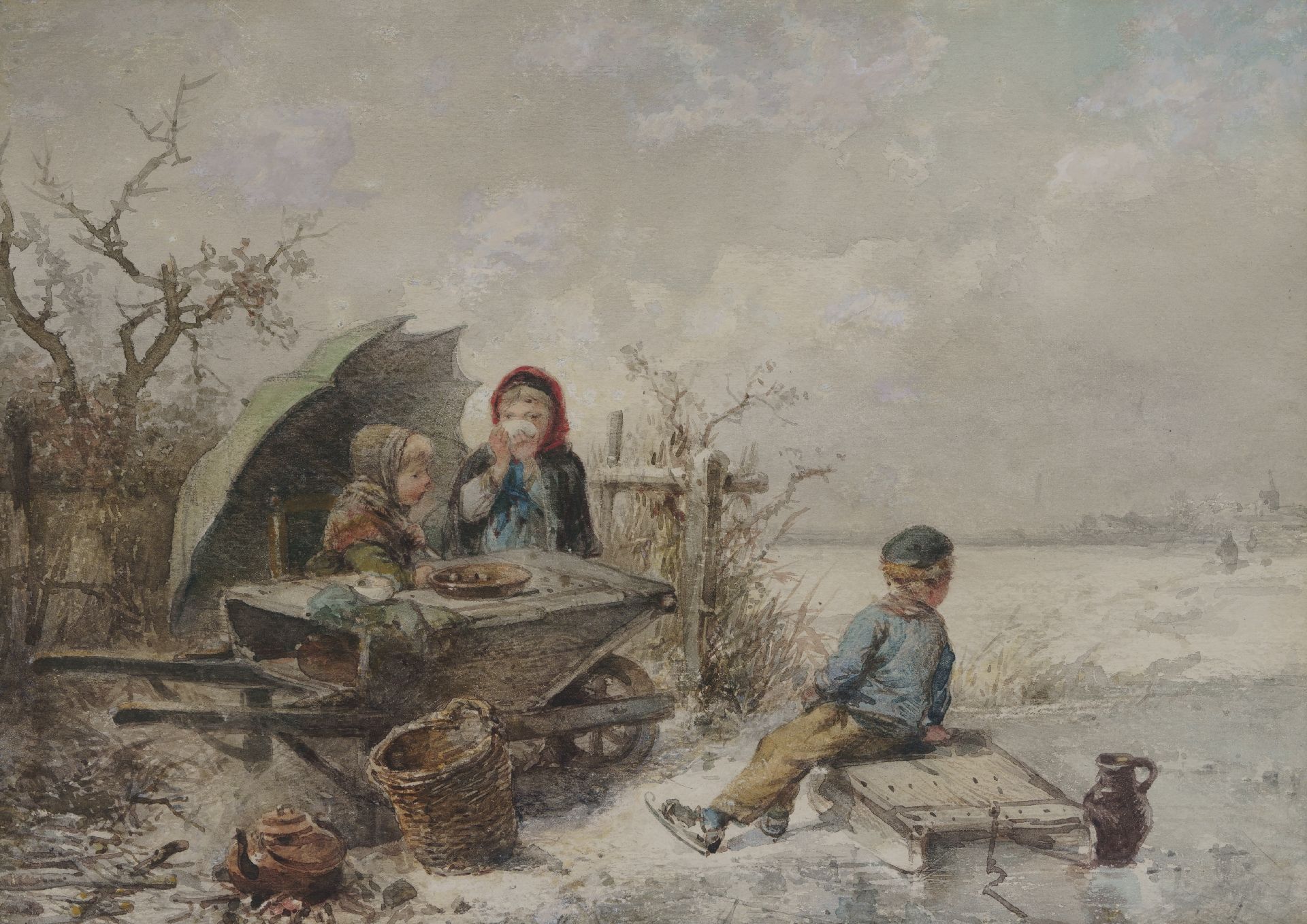 Kate J.M.H. ten | Johan 'Mari' Henri ten Kate | Aquarelle und Zeichnungen zum Verkauf angeboten | Kinder spielend auf dem Eis, Aquarell auf Papier 25,4 x 35,1 cm, Unterzeichnet u.l. (mit Resten von Signatur)