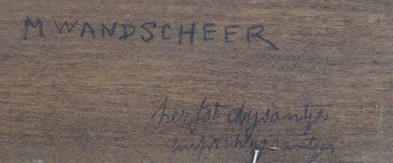 Marie Wandscheer lebte und arbeitete bis 1895 in Amsterdam, dann in Ede. Sie erhielt ihre Ausbildung in der berühmten 'Ladies Class' der Rijksacademie in Amsterdam. Dort traf sie unter anderem die Amsterdamer Jofferin Lizzy Ansingh, mit der sie sich anfreundete. Marie Wandscheer malte, bemalte und pastorierte Stillleben und Blumenstillleben, aber auch ihre Figuren, Interieurs und viele schöne Porträts. In Ede lernte sie Radierungen von Willem Witsen, als er dort von 1893 bis 1902 in der Villa Zonneberg lebte.