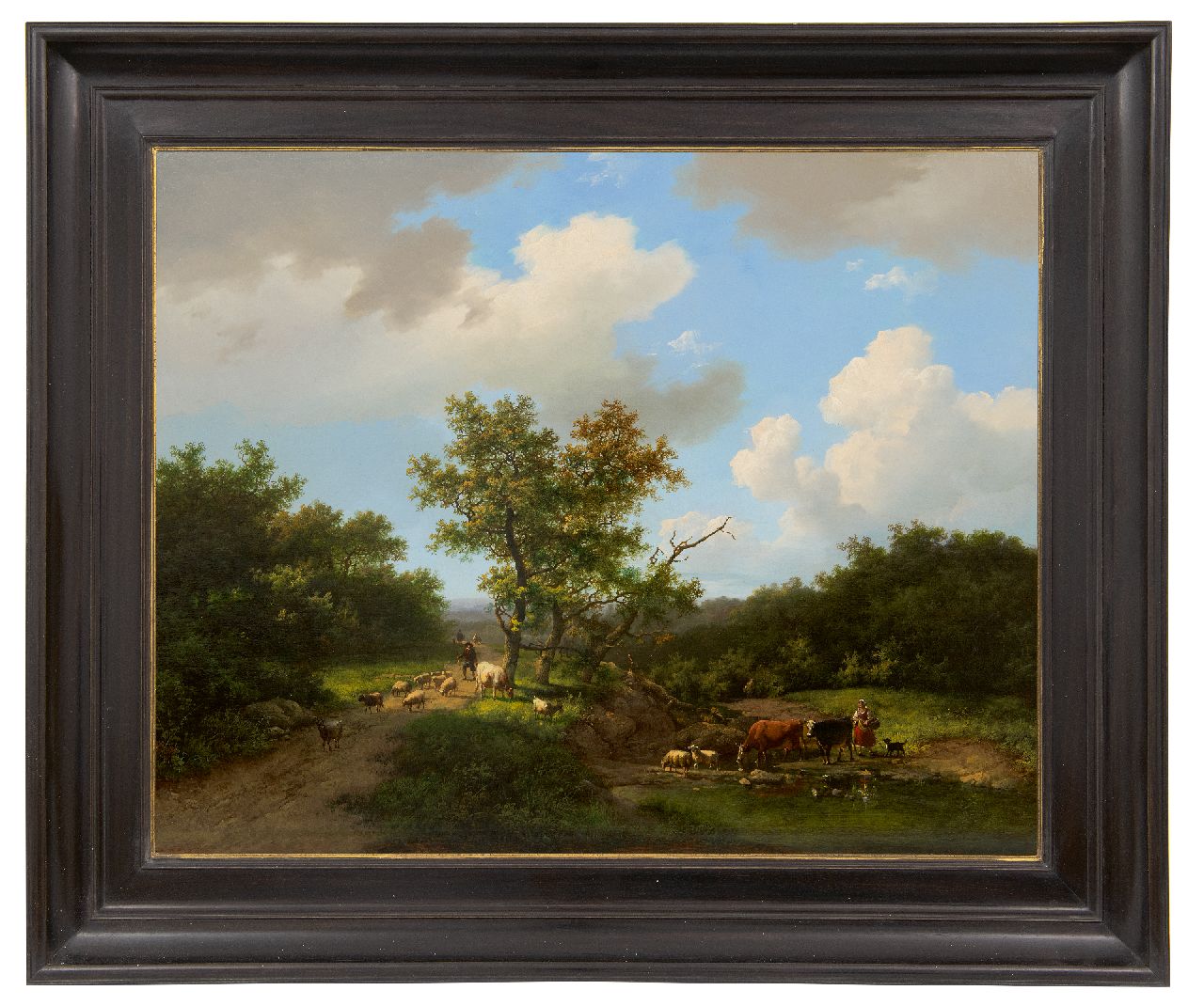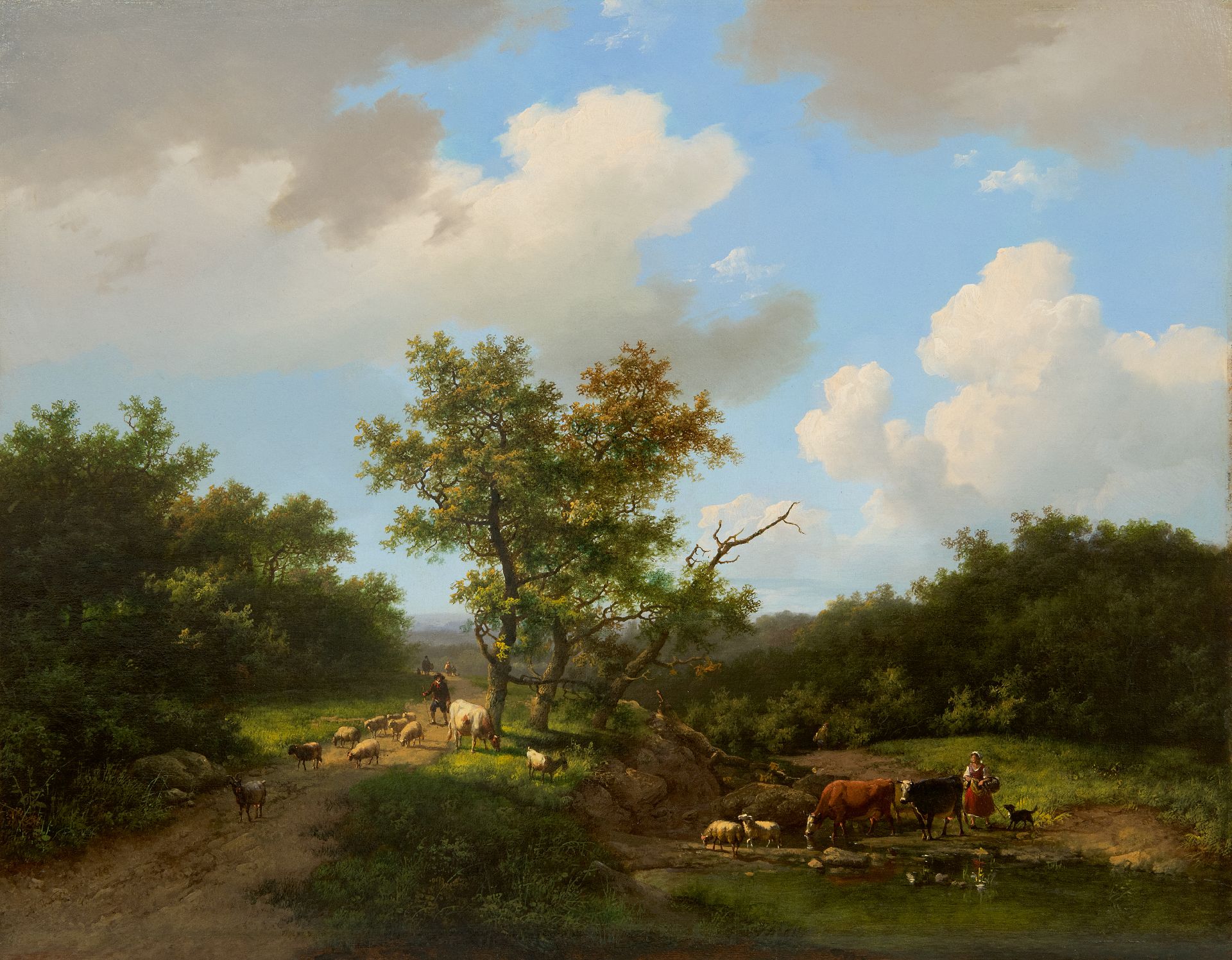 Marinus Adrianus Koekkoek war ein Schüler seines Vaters Johannes Hermanus Koekkoek. Zunächst war er Anstreicher und betrieb nebenbei eine Malerwerkstatt. 1837 zog er nach Kleve, Deutschland, um bei seinem Bruder Barend Cornelis Koekkoek in die Lehre zu gehen. Seine Landschaften, hauptsächlich Sommerszenen, sind weit und offen. Diese Landschaften sind weniger bewaldet als die Arbeit seines Bruders. Die kleinen Menschen- und Tierfiguren in seinen Landschaften veranschaulichen die romantische Vorstellung von der Größe der Natur gegenüber der Bedeutungslosigkeit des Menschen. Sein belgischer Zeitgenosse Eugène Joseph Verboeckhoven wurde wahrscheinlich von Koekkoek beauftragt, die Landschaft mit Rindern und anderen Tieren auszustatten. Bis weit ins 19. Jahrhundert war die Zusammenarbeit von Künstlern an einem Gemälde, bei der jeder Maler aus seinem Fachgebiet mitwirkte, keine Seltenheit.