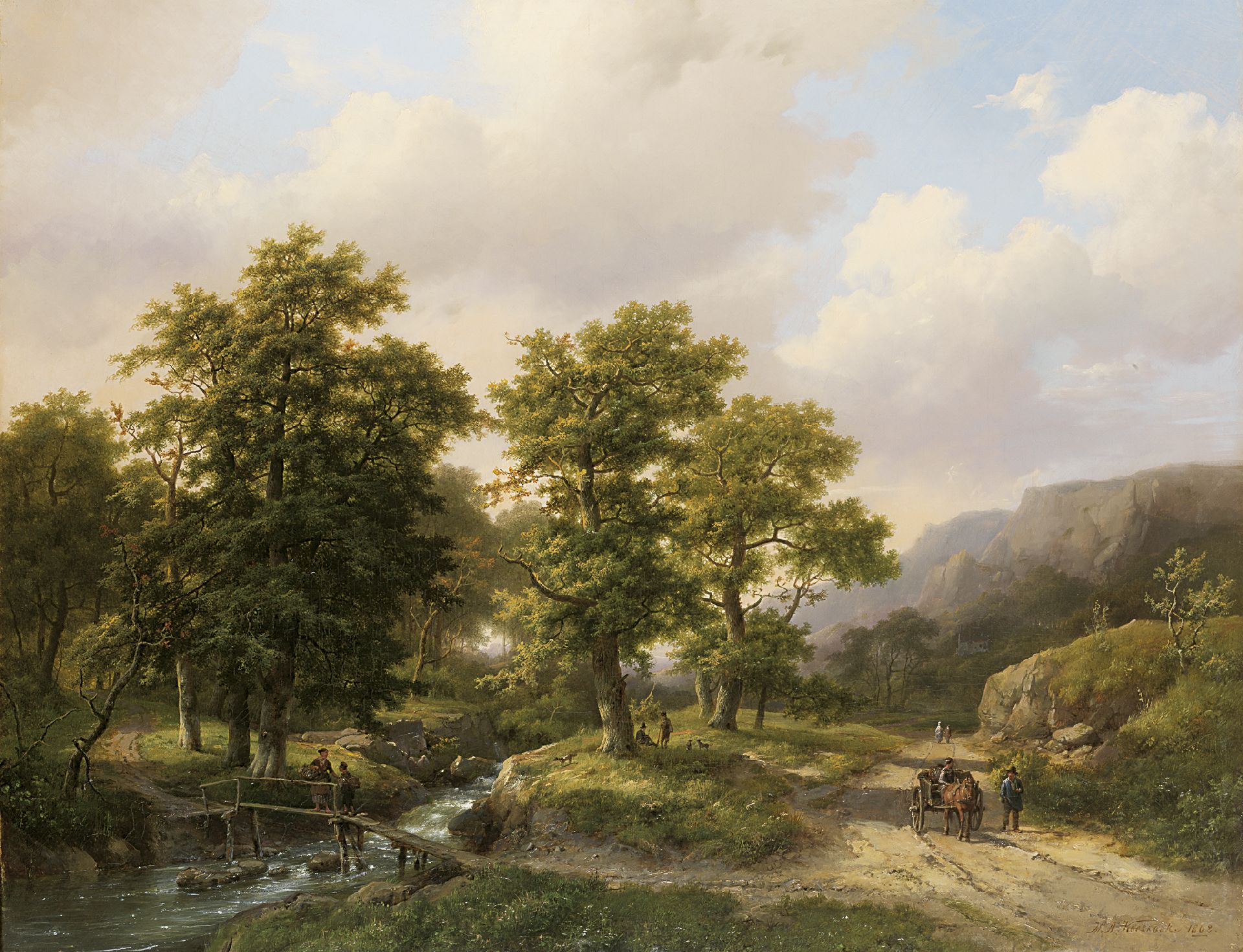 Marinus Adrianus Koekkoek I & Hermanus Koekkoek sr. Kunstwerk • Gemälde • zuvor zu verkaufen A wooded mountain landscape with a cart and figures near a creek