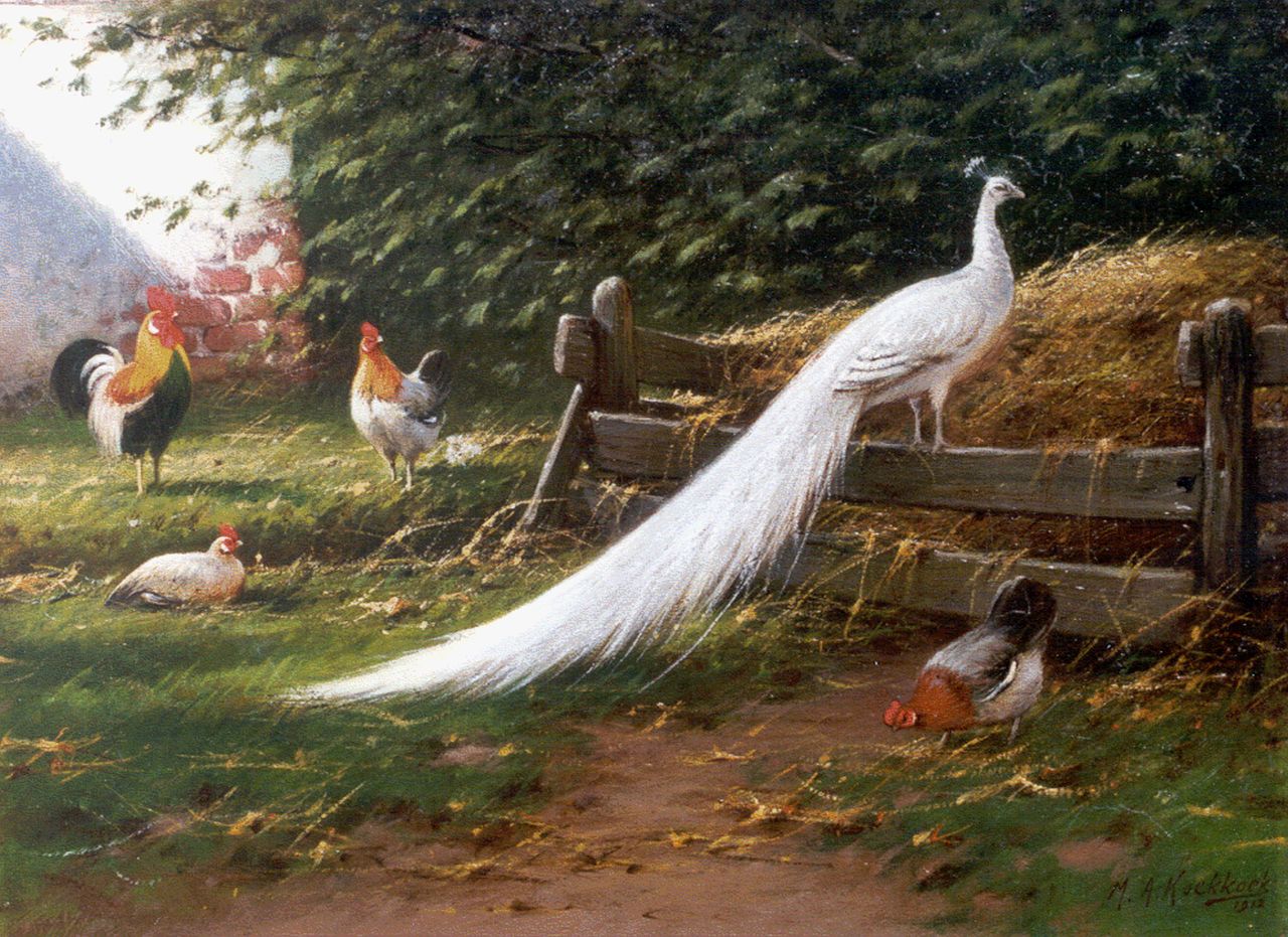 Marinus Adrianus Koekkoek II Kunstwerk • Gemälde • zuvor zu verkaufen A peacock and chickens on a yard
