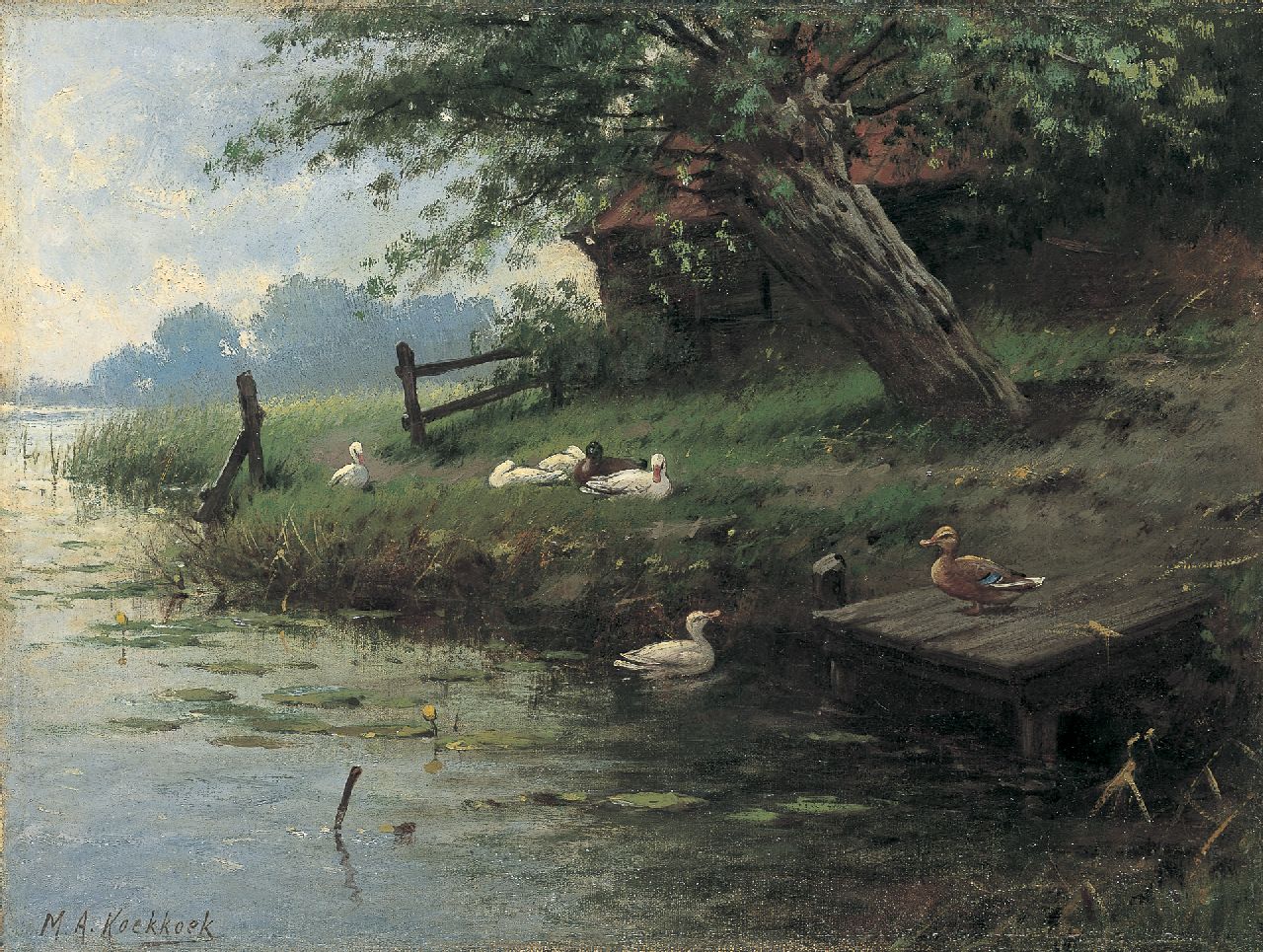 Marinus Adrianus Koekkoek II Kunstwerk • Gemälde • zuvor zu verkaufen Ducks on the riverbank