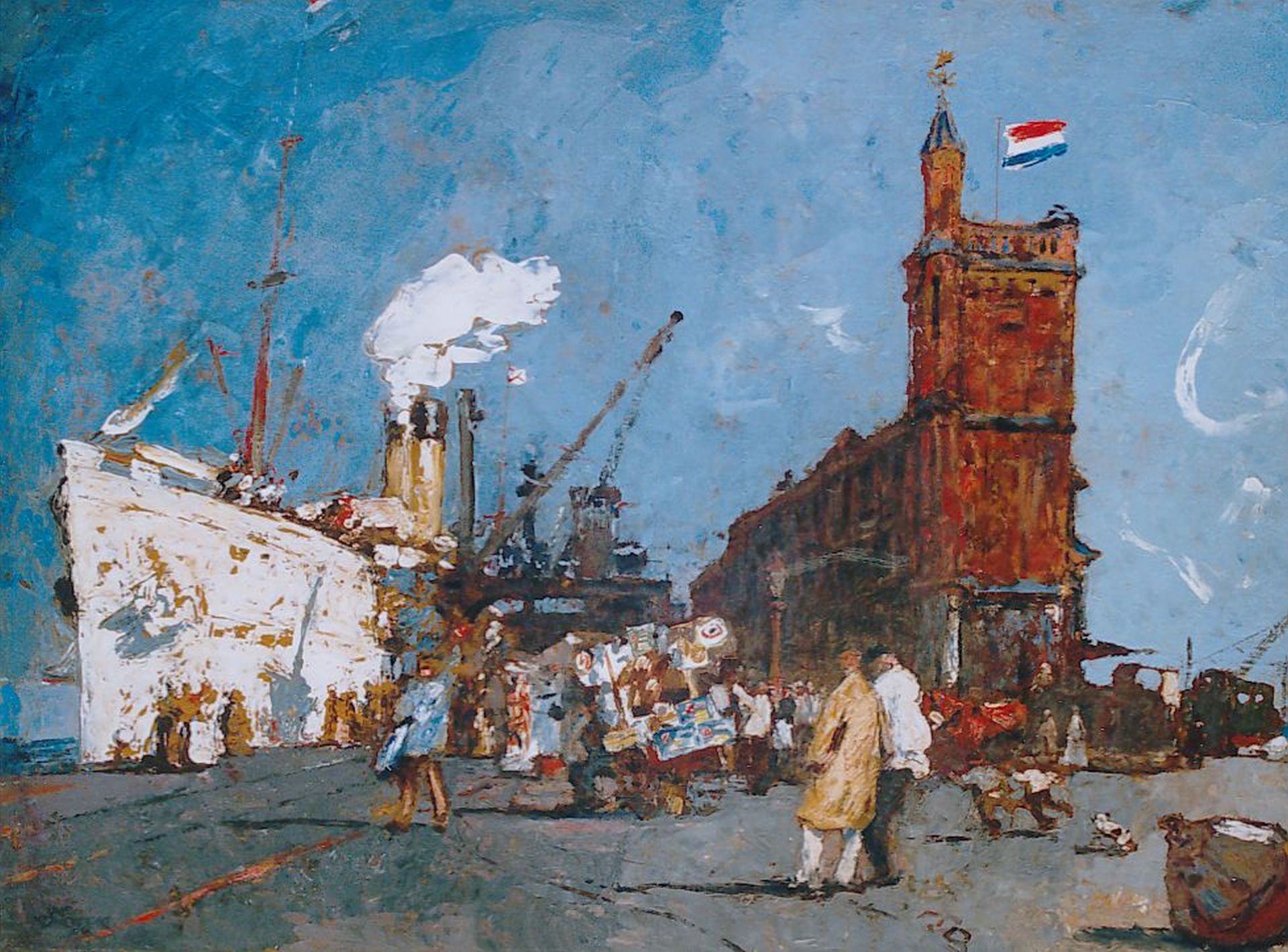 Martin Monnickendam Kunstwerk • Gemälde • zuvor zu verkaufen Ocean steamer in the harbour of Amsterdam