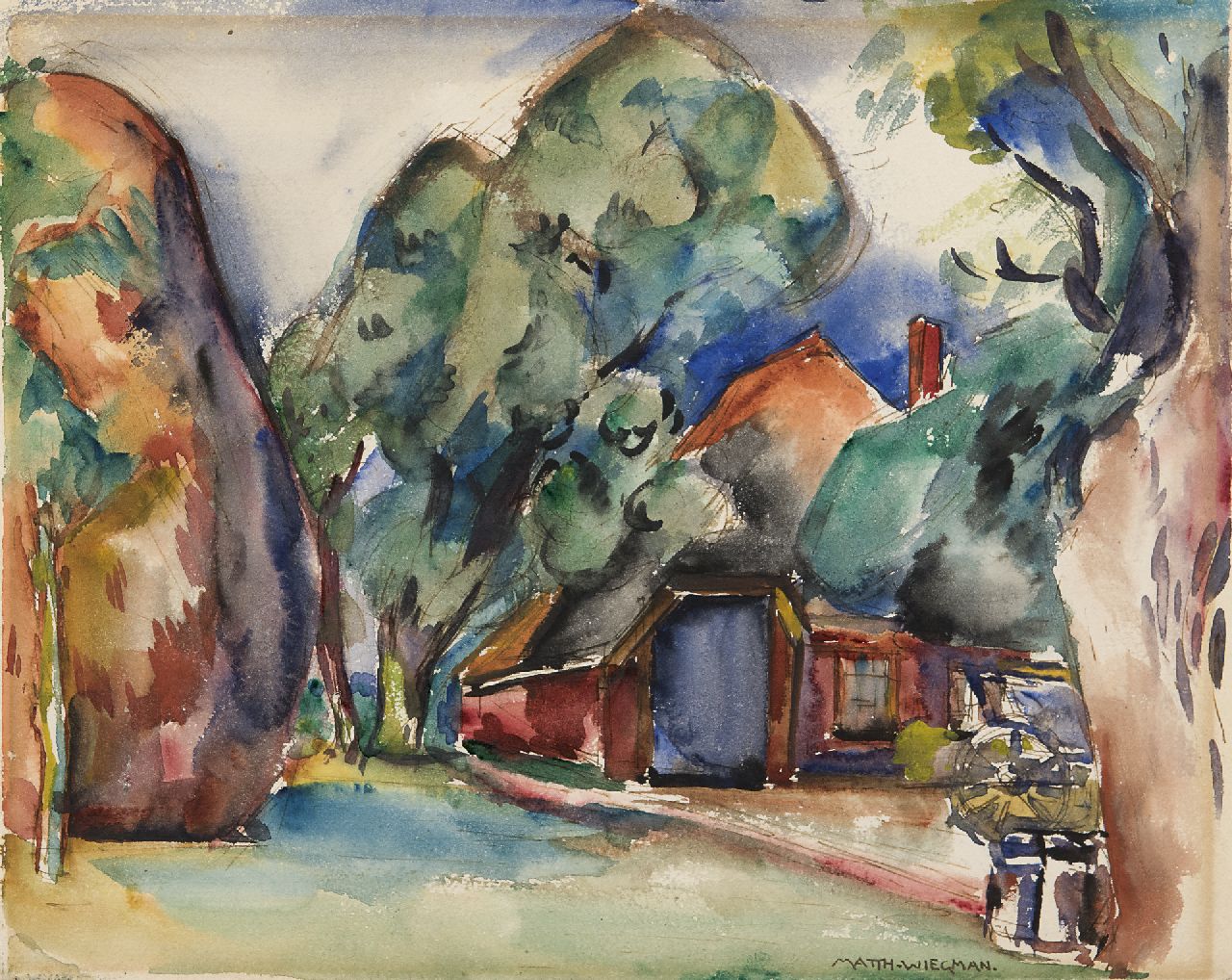 Matthieu Wiegman, Bruder von Piet Wiegman, war ein bedeutender niederländischer Expressionist. Er wurde an der Rijksacademie in Amsterdam ausgebildet und zog dann 1911 nach Bergen, wo er sich zu einem der führenden Maler der Bergener Schule entwickelte. Wiegman malte hauptsächlich Figuren, Landschaften und Stillleben. Seine Arbeiten zeigen manchmal den Einfluss des französischen Malers Cézanne in der Verwendung von warmen, fast fröhlichen Farben. In seinem späteren Leben verbrachte Wiegman viel Zeit in Frankreich. Er fertigte auch monumentale Wandmalereien, Mosaike und Buntglasfenster an, oft mit religiösen Motiven.