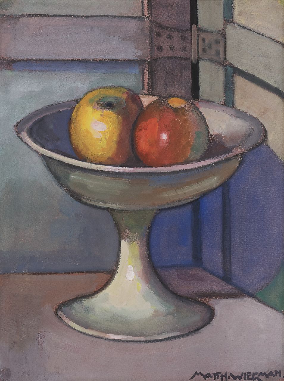 Matthieu Wiegman, Bruder von Piet Wiegman, war ein bedeutender niederländischer Expressionist. Er wurde an der Rijksacademie in Amsterdam ausgebildet und zog dann 1911 nach Bergen, wo er sich zu einem der führenden Maler der Bergener Schule entwickelte. Wiegman malte hauptsächlich Figuren, Landschaften und Stillleben. Seine Arbeiten zeigen manchmal den Einfluss des französischen Malers Cézanne in der Verwendung von warmen, fast fröhlichen Farben. In seinem späteren Leben verbrachte Wiegman viel Zeit in Frankreich. Er fertigte auch monumentale Wandmalereien, Mosaike und Buntglasfenster an, oft mit religiösen Motiven.