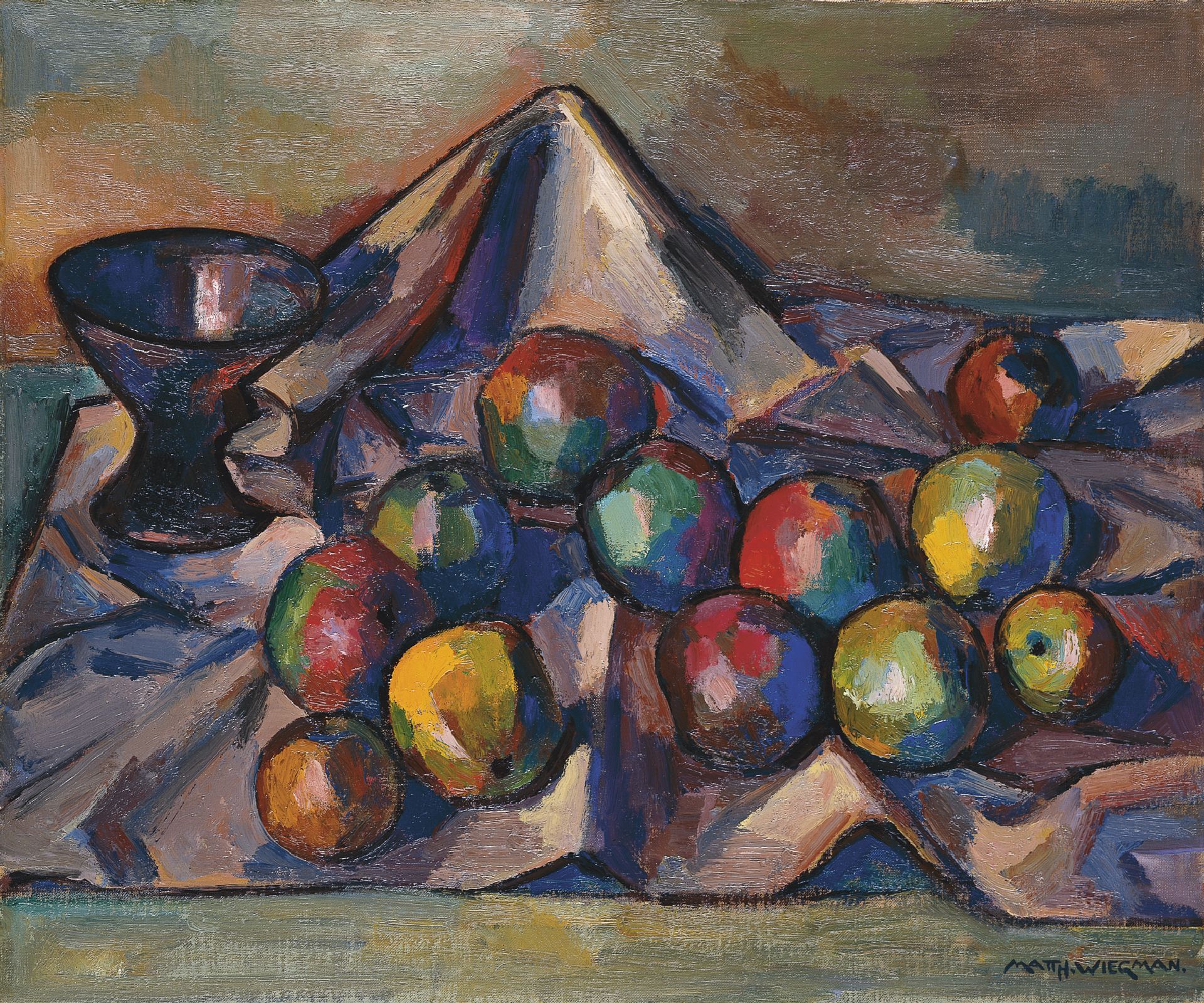 Wiegman M.J.M.  | Mattheus Johannes Marie 'Matthieu' Wiegman, Still life with apples, Öl auf Leinwand auf Holz 54,2 x 65,2 cm, signed l.r. und dated verso 1956