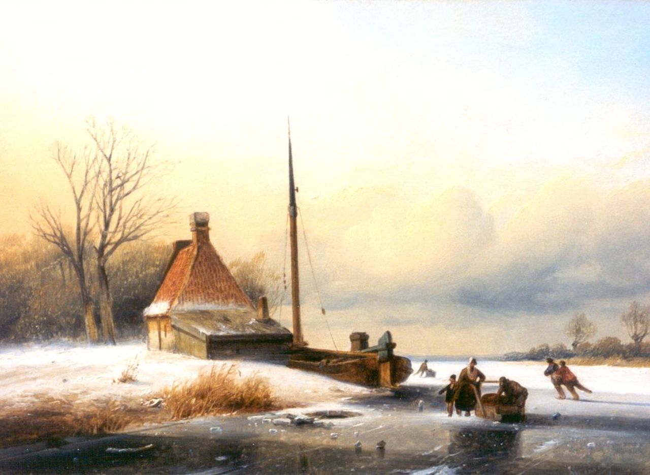 A winter landscape with skaters on the ice