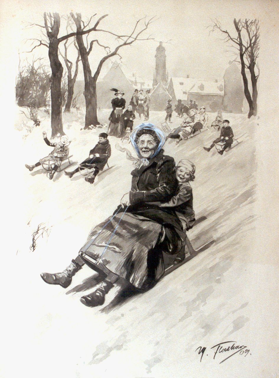 Max Flashar Kunstwerk • Aquarell • Zeichnung • zuvor zu verkaufen Sledging downhill