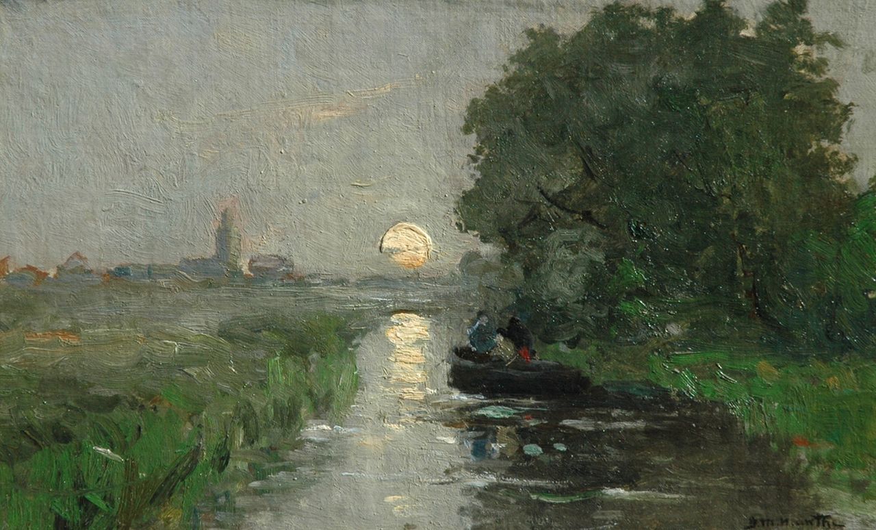 Morgenstjerne Munthe Kunstwerk • Gemälde • zuvor zu verkaufen De Vliet by moonlight, with the Laurentiustoren of Rijnsburg in the distance