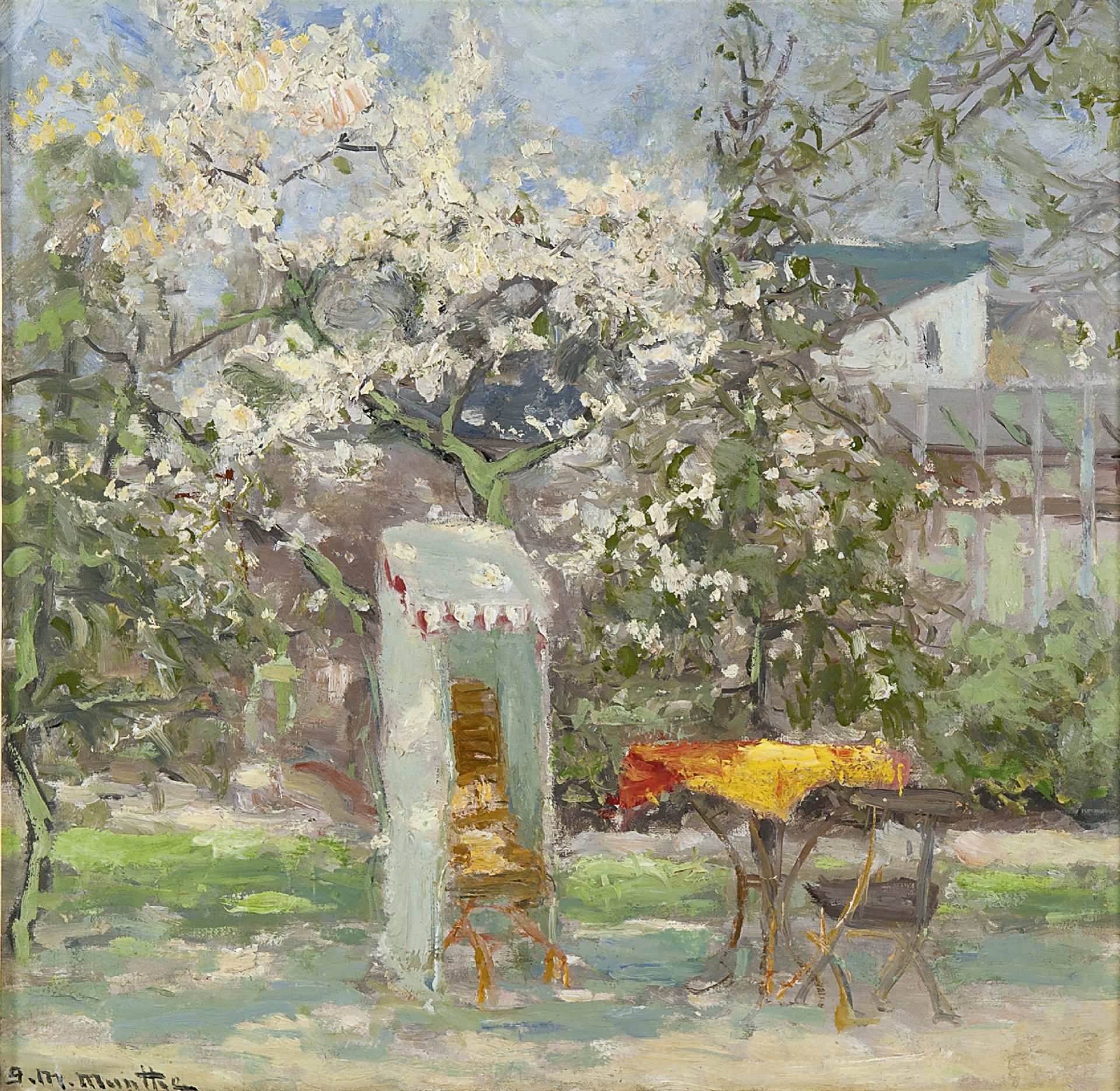 Morgenstjerne Munthe Kunstwerk • Gemälde • zuvor zu verkaufen Garden with patio under blossoming tree