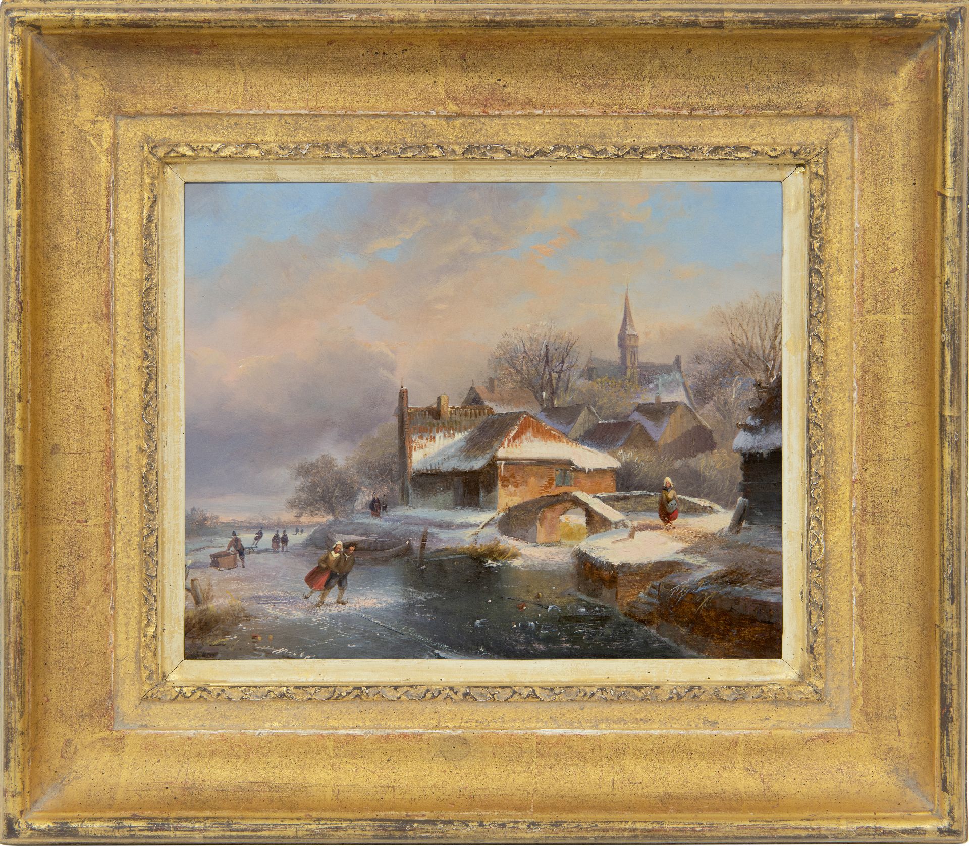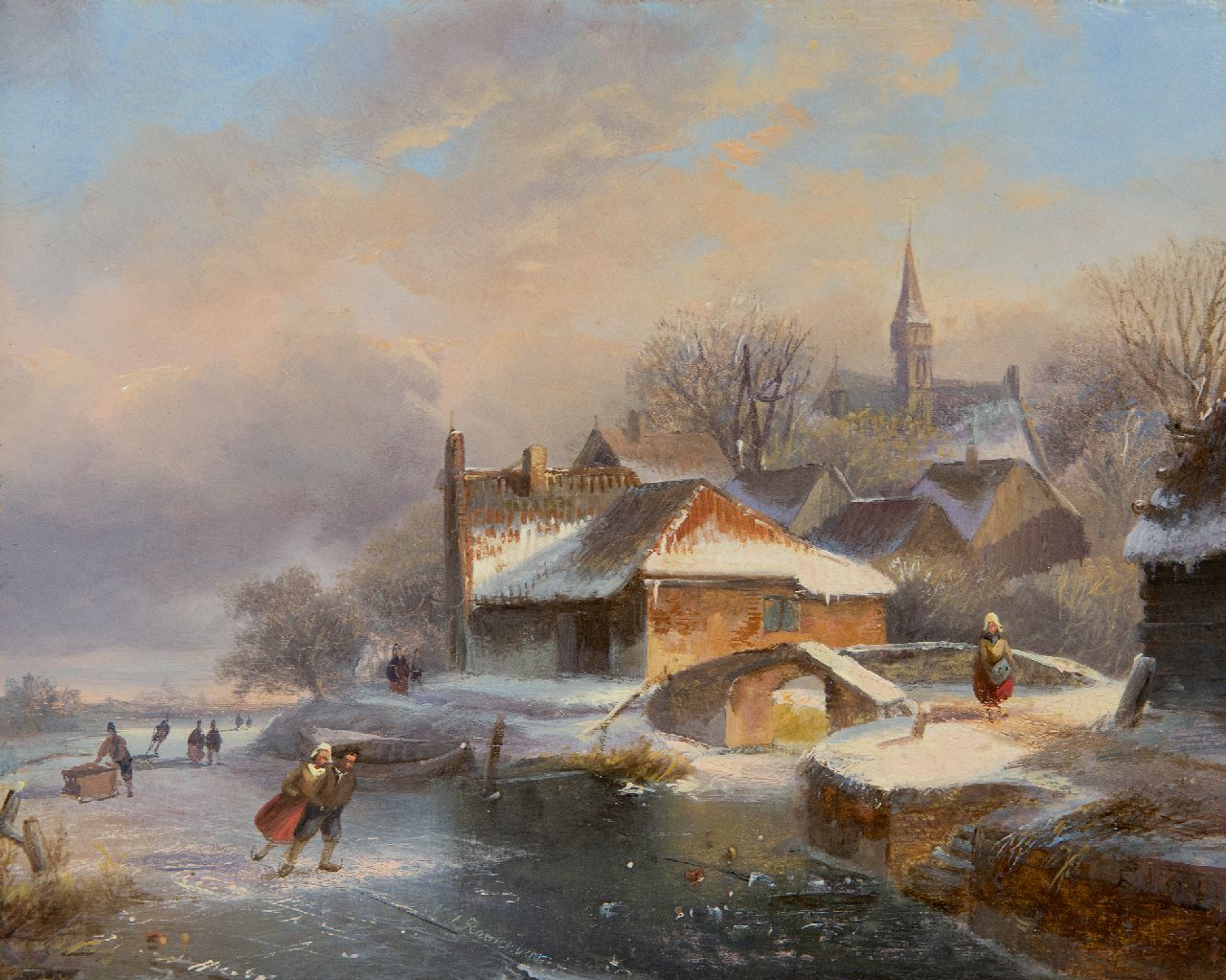 Nicolaas Roosenboom Kunstwerk • Gemälde • zuvor zu verkaufen Schlittschuhläufer bei einem beschneiten Dorf