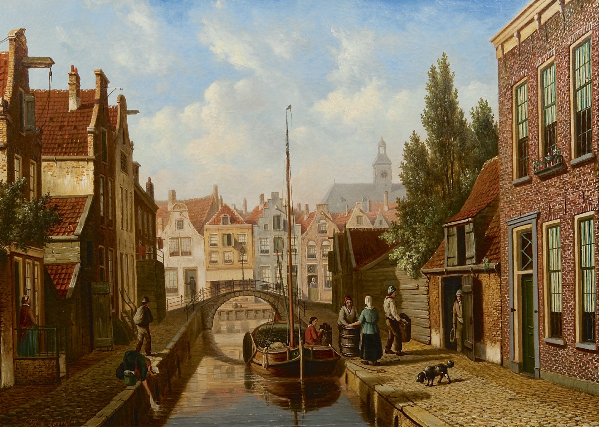 Die Stadtansichten von Oene Romkes de Jongh zeigen alle Merkmale der romantischen holländischen Stadtansicht wie die im Amsterdam des 19. Jahrhunderts gestaltet wurde: die präzise Ausarbeitung, die lebhafte Ausstattung und die Aufmerksamkeit für alte, holländische Architektur. Vom Maler selbst ist nicht viel bekannt. Er wurde 1812 in Makkum geboren und wohnte und arbeitete vemutlich das grösste Teil seines Lebens in Amsterdam. Da inspirierten ihn namentlich die Werke seiner Zeitgenossen Cornelis Springer und dessen Lehrling Adrianus Eversen. Das Werk des Malers enthält stimmungsvolle Stadtansichten sowohl im Sommer wie im Winter, unter anderem vom Amsterdam und der Zuiderseehäfen, und einige Landschaften.