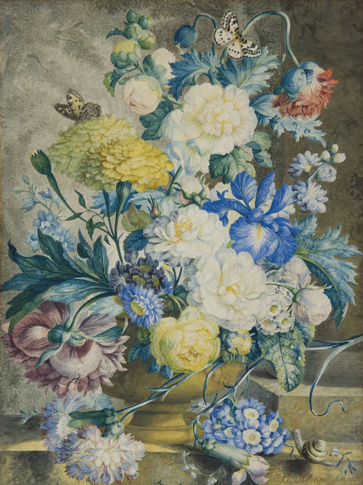 Dieser Maler aus dem 18. Jahrhundert wurde 1736 in Heusden geboren. Er spezialisierte sich auf Aquarelle von üppige Blumen- und Obststilleben. Diese farbenreiche Arbeit auf Papier ist denn auch repräsentativ für das Werk von Oswald Wijnen. Sein grosses Vorbild war der berühmte Amsterdamer Blumenmaler Jan van Huijsum. Er war bekannt für seine Blumenstilleben, die mit Blumen aus verschiedenen Jahreszeiten zusammengestellt sind. Seine Zeichnunge wurden u.a. von seinem Zeitgenossen und einer der wichtigsten Kunstsammler der Niederlande, Cornelis Ploos van Amstel (1726-1798) gekauft. Heute besitzt das Teylermuseum in Haarlem mehrere Werke von diesem Aqurellisten. Der Zeichner starb im Jahre 1790 zu Amsterdam.