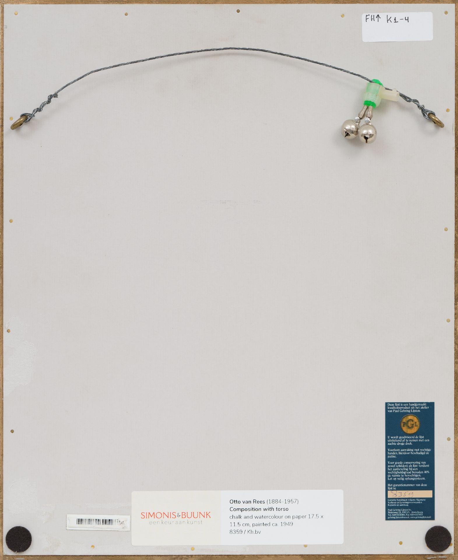 Zu Beginn des 20. Jahrhunderts war Otto van Rees in Kreisen der internationalen Modernisten (Fauvismus, Kubismus, Dadaismus) und arbeitete mit Avantgardisten wie Jan Toorop, Kees van Dongen und Jean Arp zusammen. 1904, als er zwanzig Jahre alt war, zog er nach Paris und mietete einen Raum im berühmten Ateliergebäude Bateau-Lavoir, wo er Braque und Picasso kennenlernte. Um 1910 wird der Einfluss des französischen Kubismus in der abstrakten Gestaltung seiner Gemälde und experimentellen Collagen sichtbar. 1933 kehrte Van Rees endgültig zurück und ließ sich in Utrecht nieder. Dort freundete er sich gut mit Gérard Grassère an. Als er 1957 bei einem Verkehrsunfall starb, wurde Grassère teilweise mit der Pflege des Nachlasses beauftragt. Er zog in Van Rees' Haus und Studio in der Bouwstraat 45 ein. Es ist bekannt, dass er Van Rees' Arbeit dort mit dem Monogramm VR versorgte. Vermutlich ist dies auch hier der Fall. Dieses Aquarell ist eine Vorstudie aus einer Serie für das Gemälde 'Torso and House', 1949.