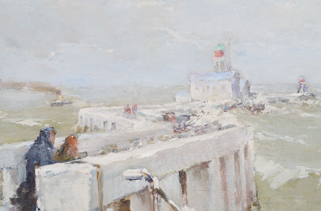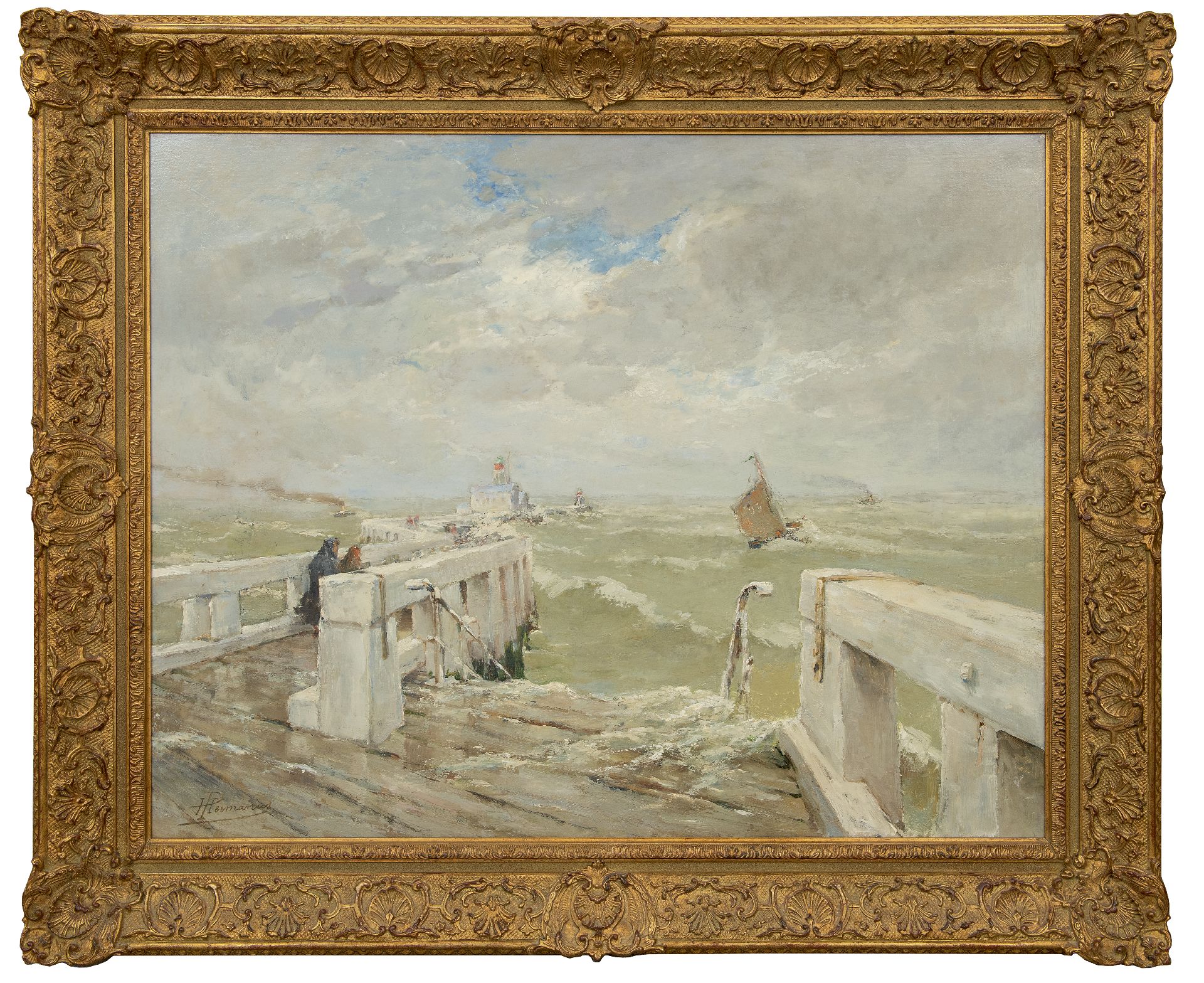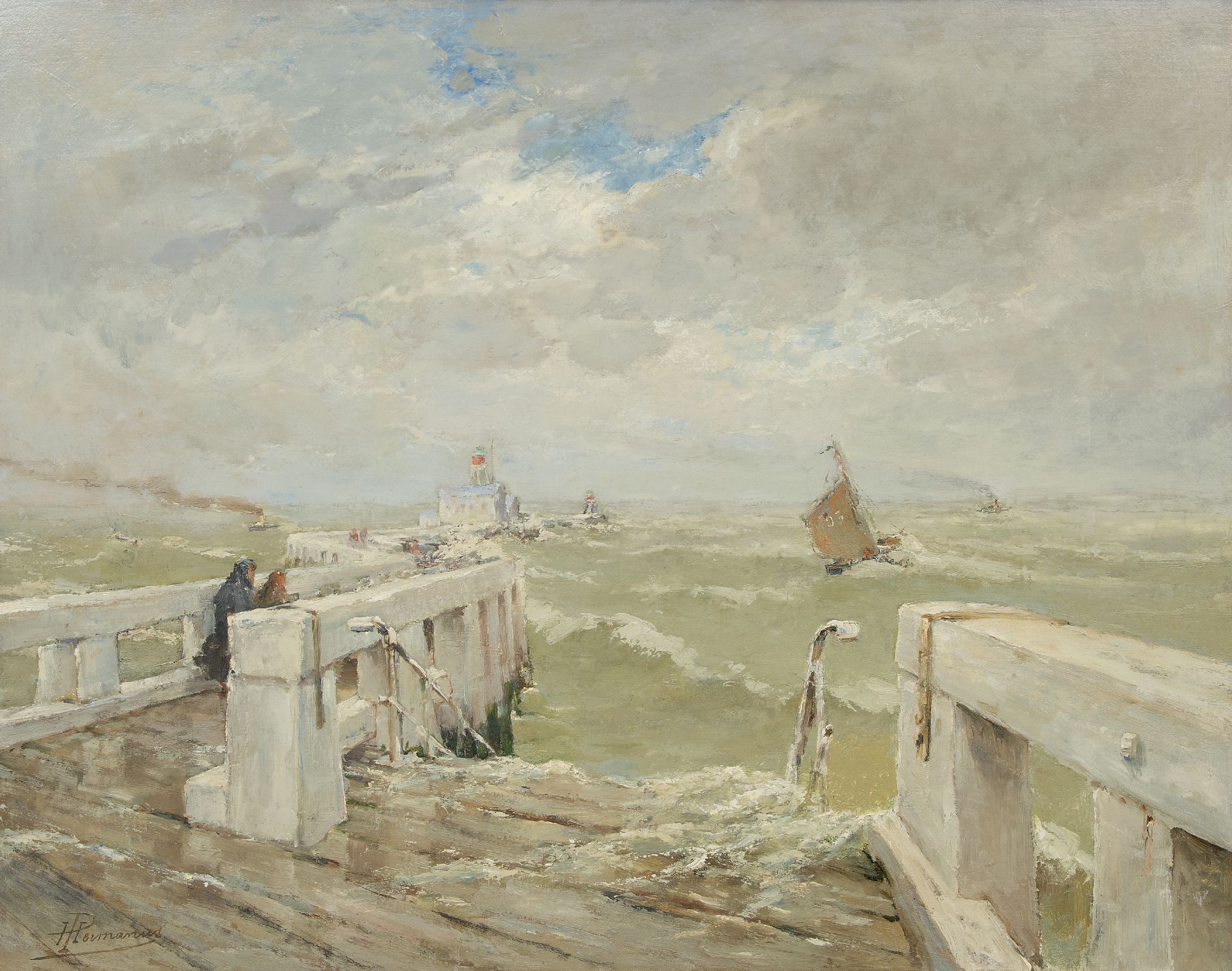 Paul Hermanus Kunstwerk • Gemälde • zuvor zu verkaufen Figuren auf einem Pier in der Nähe eines Leuchtturms in turbulenter Brandung
