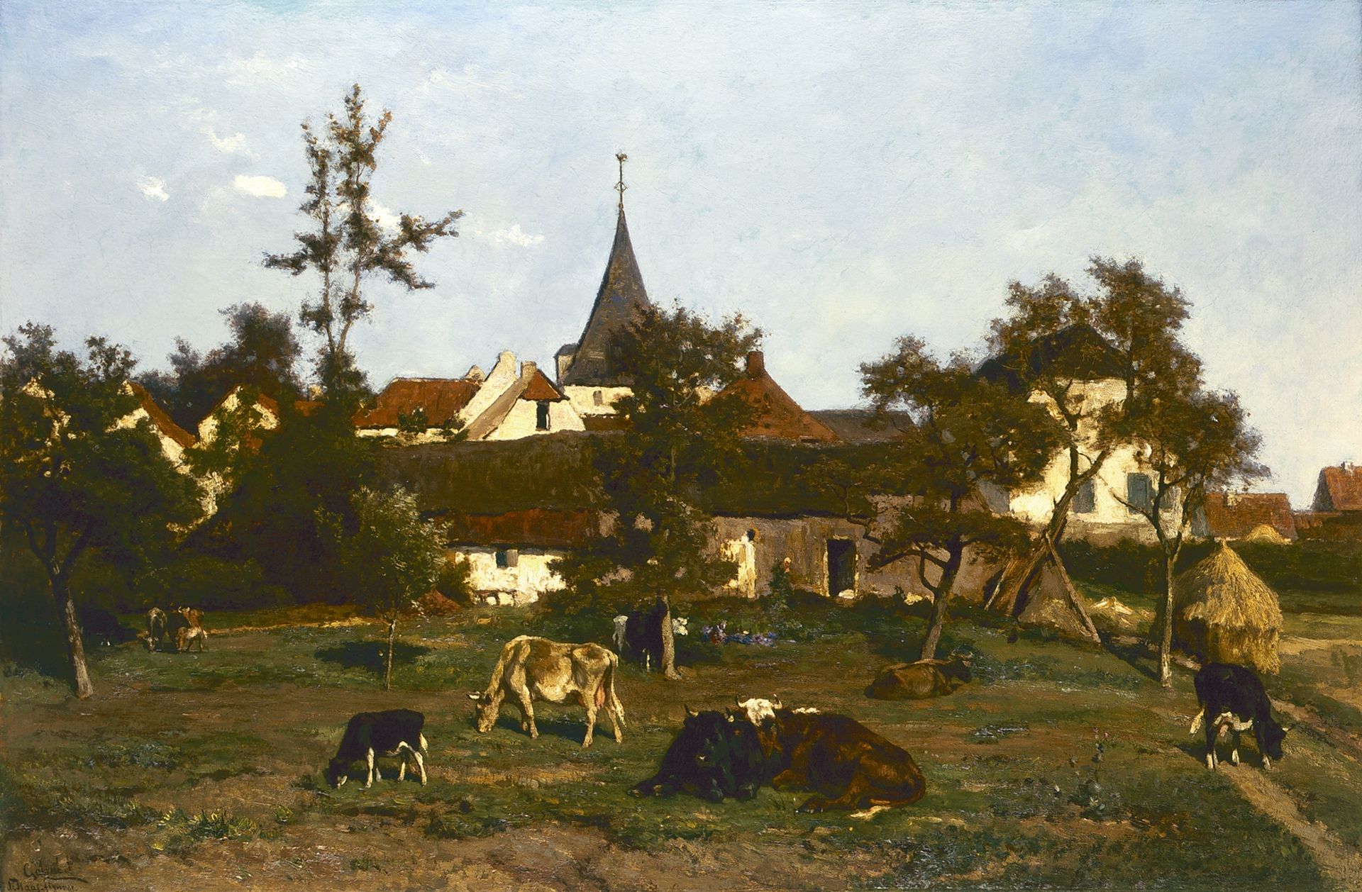 Paul Joseph Constantin Gabriel wurde als herausragender Porträtist des niederländischen Polder bezeichnet. In Oosterbeek lernte er Malen in der Natur, wo er einige Zeit zusammen mit Johannes Warnardus Bilders und Jan de Haas verbrachte. Er lebte zwischen 1860 und 1884 in Brüssel. Von dort kehrte er regelmäßig zurück, um die niederländischen Seen und Polder zu bemalen. Gabriel entwickelte sich schließlich zu einem der führenden Maler der Haager Schule. Fast alle großen Museen haben seine Arbeit. Robuste, gut genährte Rinder sind in den Gemälden von J.H.L. Der Hase. Das Malen von Rindern lernte er bei Pieter Frederik van Os in Haarlem. Danach praktizierte er während seines Aufenthalts (1854-56) in Oosterbeek Landschaftsmalerei, wo er in Begleitung von P.J.C. Gabriel. 1857 zog De Haas in Anlehnung an Willem Roelofs nach Brüssel, kehrte jedoch regelmäßig nach Holland zurück, um Inspiration für seine Arbeit zu finden. Er polsterte eine Reihe von Gemälden von Gabriel und Willem Roelofs mit Kühen.
