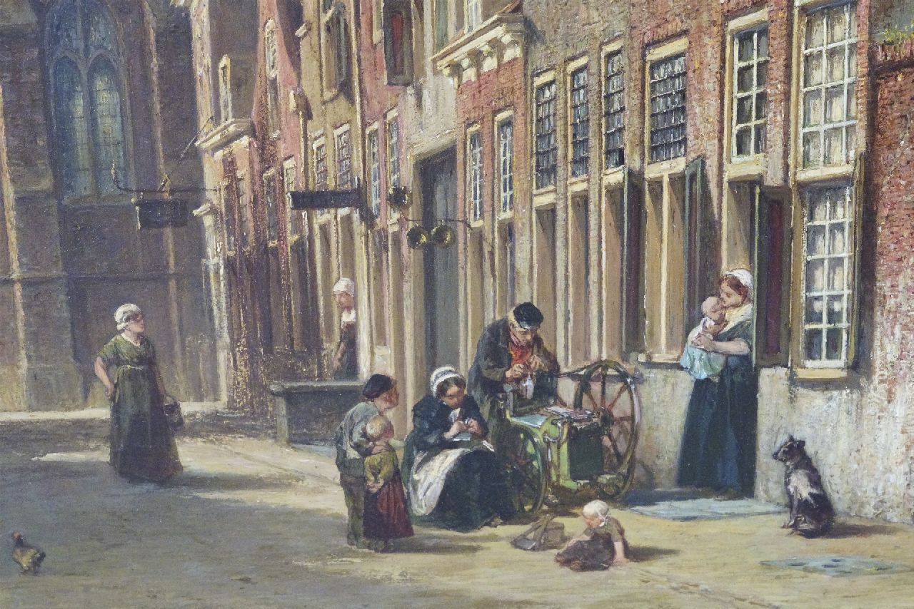 Petrus Gerardus Vertin lebte und arbeitete hauptsächlich in Den Haag. Er malte im Sommer und Winter Stadtlandschaften. Manchmal ist seine Arbeit topografisch, aber meistens malte er Fantasy-Szenen. Vor allem in den Wintern legte Vertin großen Wert auf die Lichtreflexion auf Häusern und Straßen. Charles Rochussen malte die Polsterung in diesem Stadtbild. Er stammte aus einer wohlhabenden Familie und entschied sich erst relativ spät für das Malen. Er malte hauptsächlich historische und militärische Szenen, aber auch ein Thema war der Zeitvertreib von Gesellschaftskreisen wie Trabrennen und Segelwettbewerben. Rochussen war auch ein erfahrener Lithograf und Illustrator.