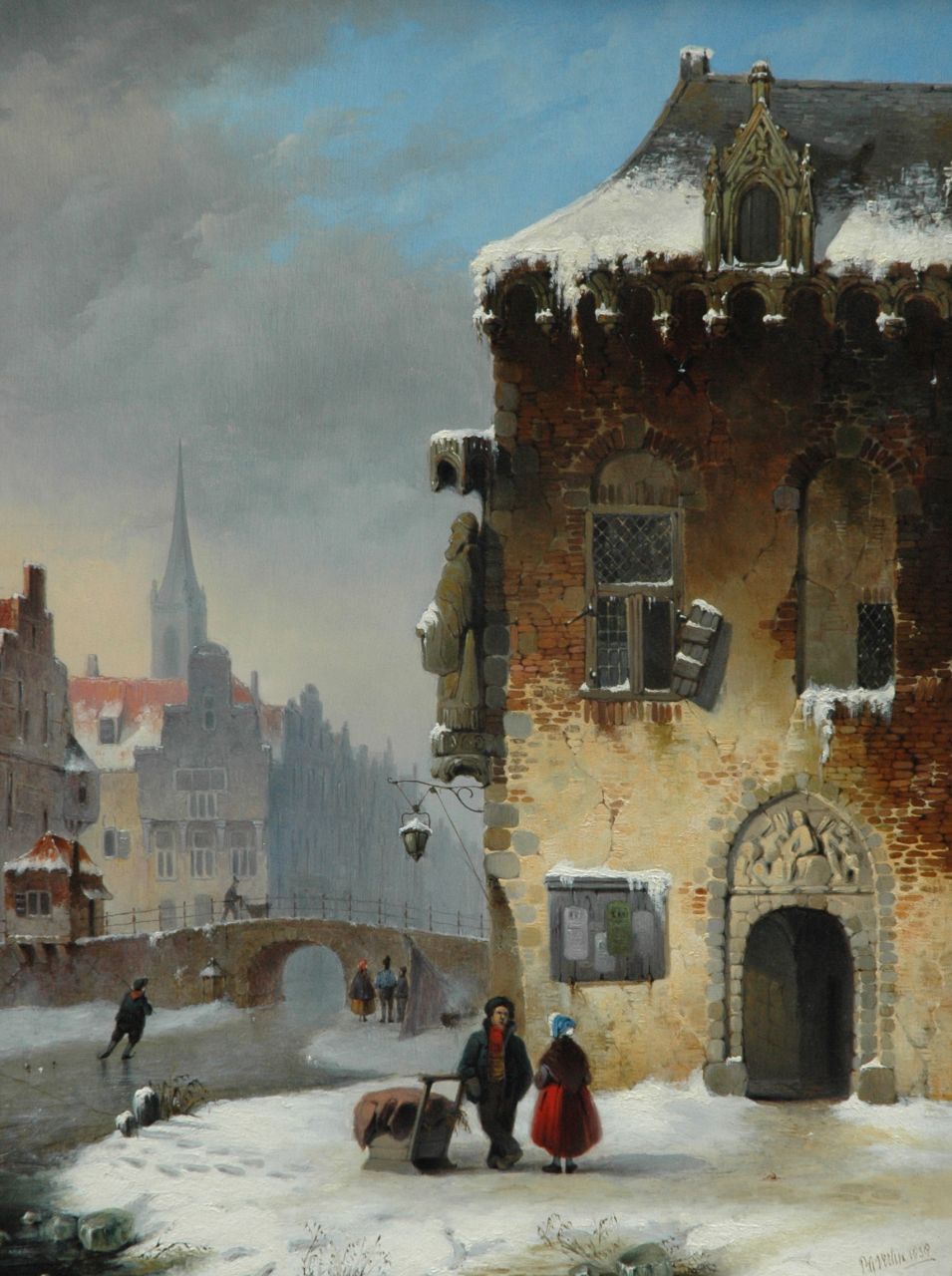 Petrus Gerardus Vertin Kunstwerk • Gemälde • zuvor zu verkaufen A town in winter with strollers and skaters