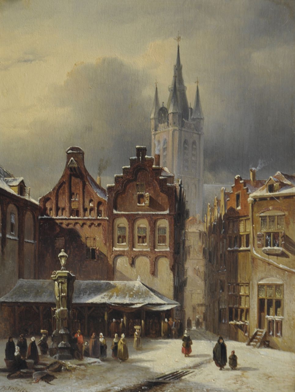 Petrus Gerardus Vertin Kunstwerk • Gemälde • zuvor zu verkaufen A town view in winter with the Oude Kerk of Delft