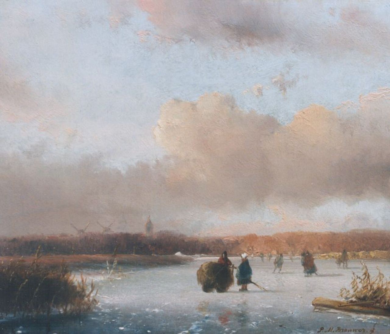 Petrus Marius Brouwer verdankt seinen Ruhm vor allem der Tatsache, dass er in den Jahren 1843-1847 in Den Haag lebte und Schüler von Andreas Schelfhout war. Brouwer wurde von seinem Lehrer gründlich unterrichtet, was zu wunderschönen, romantischen Sommerlandschaften, Eisszenen und Strand- und Waldansichten führte, die oft auf Holz gemalt wurden. Er malte und zeichnete auch Tierszenen. Über das Leben des Künstlers ist nicht viel bekannt. Obwohl er regelmäßig auf den Ausstellungen Lebender Meister ausstellte, war Malerei wohl nicht sein Beruf. Es ist bekannt, dass er von 1866 bis 1877 Bürgermeister von Zwijndrecht war.