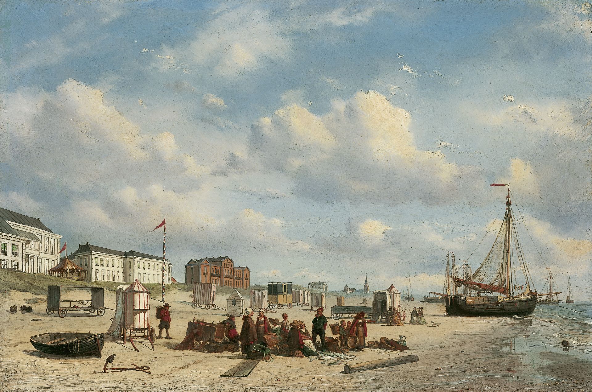 Petrus Paulus Schiedges Kunstwerk • Gemälde • zuvor zu verkaufen A fish auction and an elegant company on the beach of Scheveningen