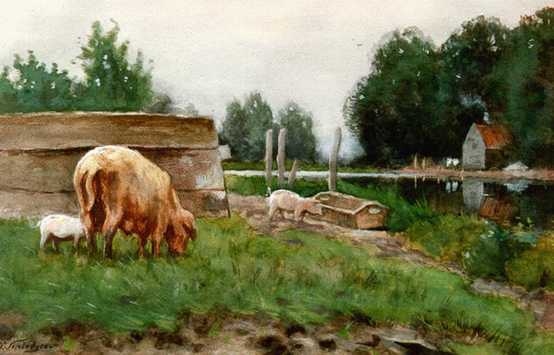 Petrus Paulus Schiedges jr. Kunstwerk • Aquarell • Zeichnung • zuvor zu verkaufen A sow with piglets