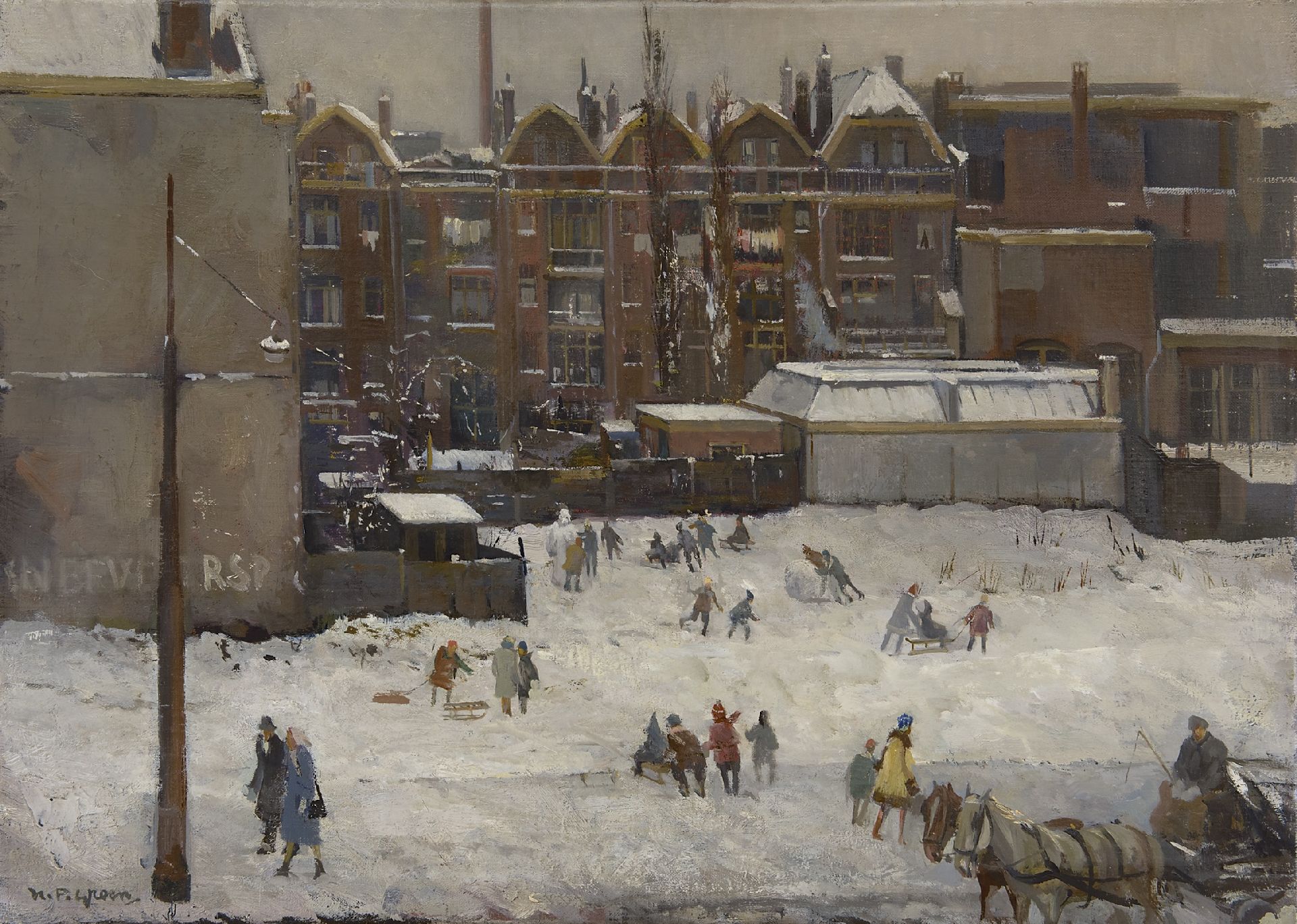Piet Groen Kunstwerk • Gemälde • zuvor zu verkaufen Schneevergnügen in Rotterdam