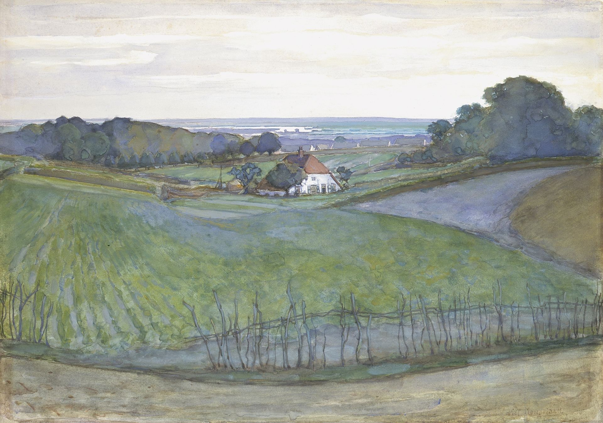 Piet Mondriaan Kunstwerk • Aquarell • Zeichnung • zuvor zu verkaufen A farm in a landscape, with Arnhem in the distance
