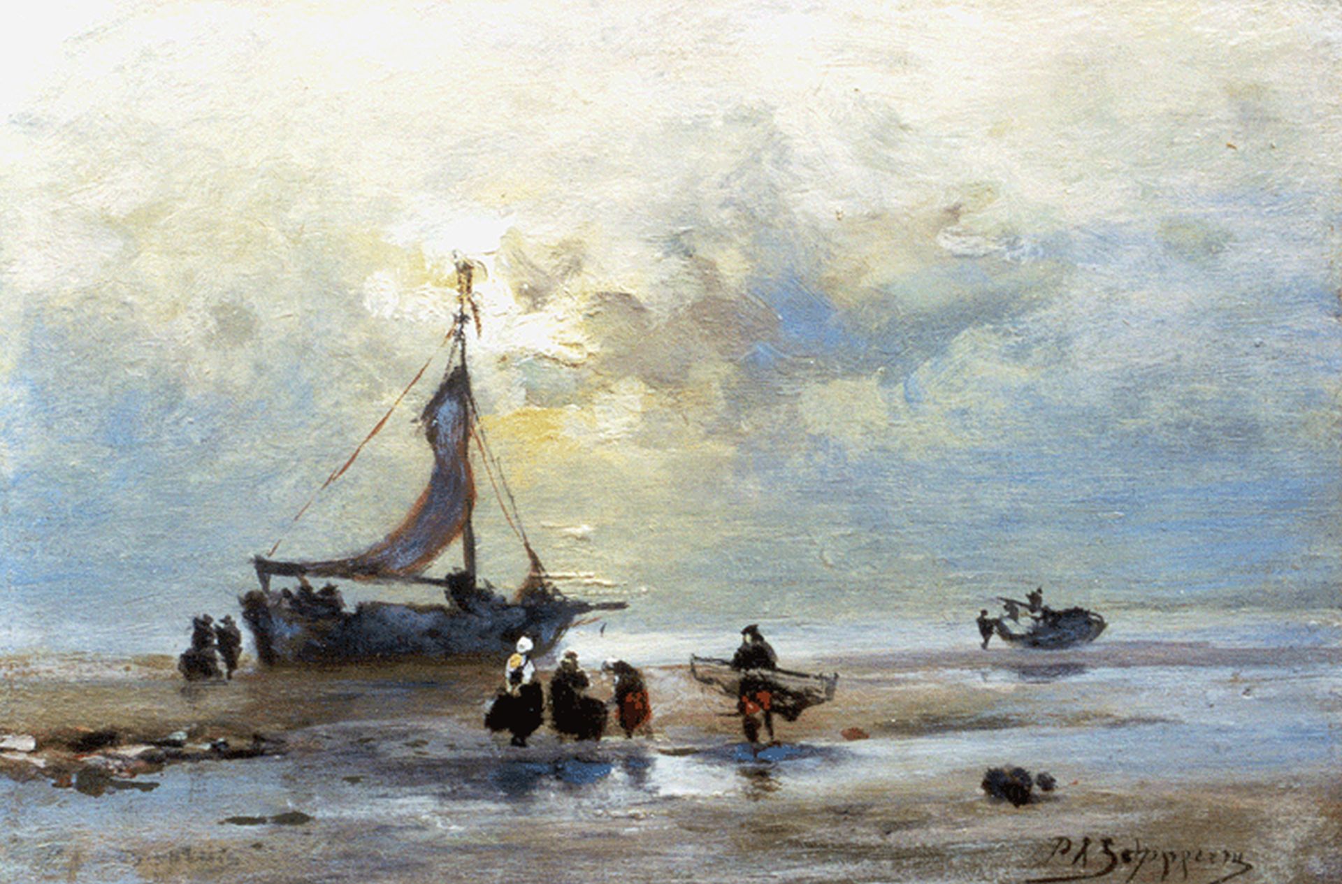 Piet Schipperus Kunstwerk • Gemälde • zuvor zu verkaufen A 'bomschuit' on the beach, Scheveningen