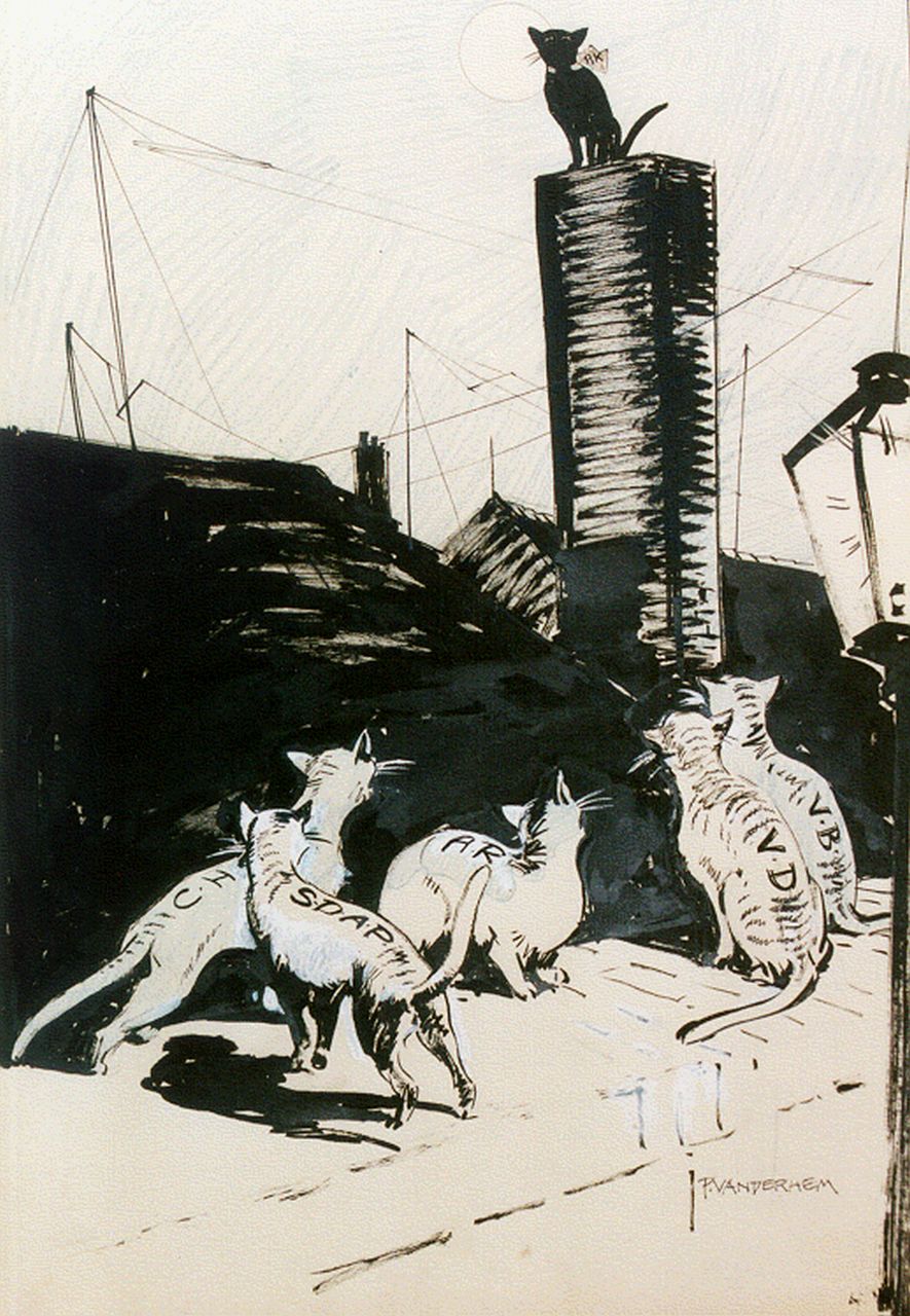 Piet van der Hem Kunstwerk • Aquarell • Zeichnung • zuvor zu verkaufen 'De katers van de C.H., S.D.A.P., A.R., V.D. en V.B.'